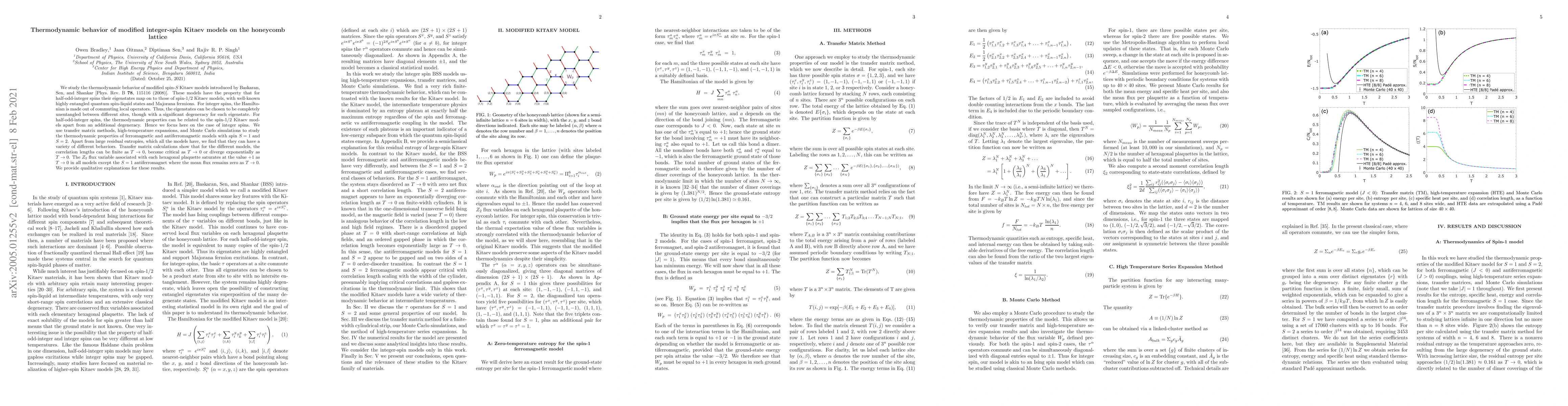 Researchers studied thermodynamic properties of modified Kitaev models on a honeycomb lattice for integer spins, finding varying behaviors in correlation lengths and conservation of $Z_2$ flux variables as temperature approaches zero.
