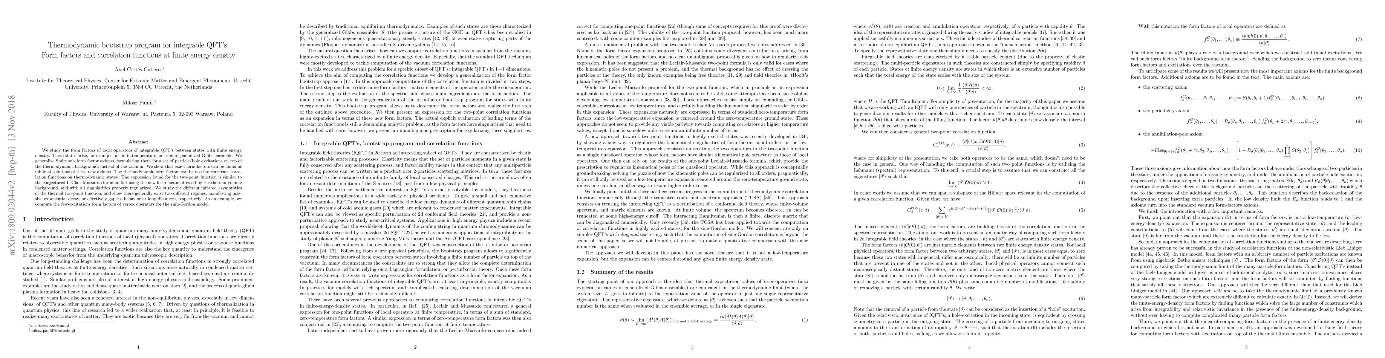 This paper develops a thermodynamic bootstrap program for integrable quantum field theories (QFT) to determine form factors and correlation functions at finite energy density. It generalizes Smirnov's form factor axioms for states with thermodynamic background, revealing exact form factors and constructing correlation functions, including a regularized version of the LeClair-Mussardo formula.