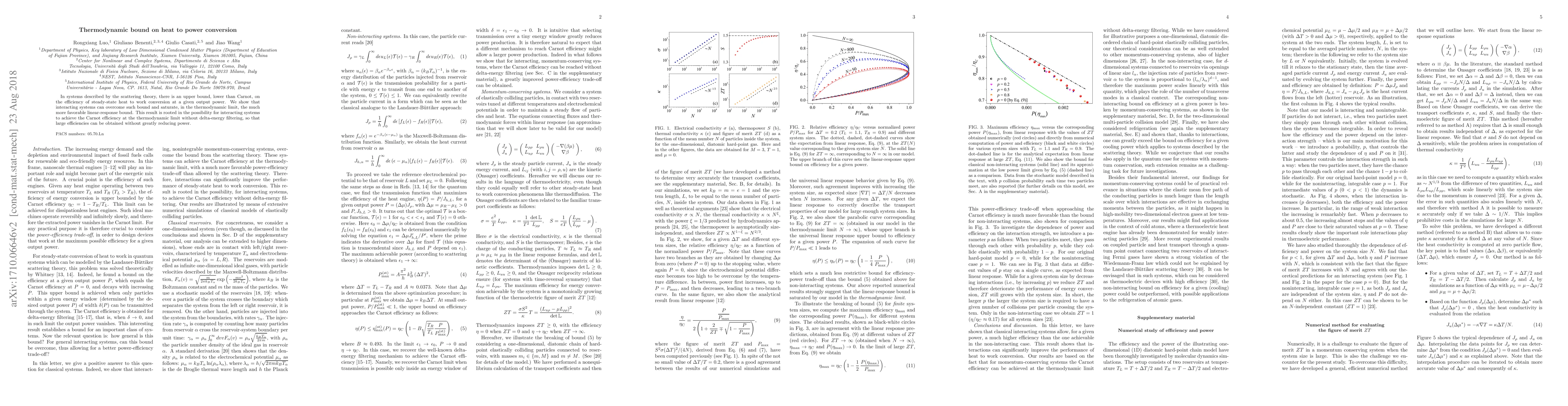 In systems described by the scattering theory, there is an upper bound, lower than Carnot, on the efficiency of steady-state heat to work conversion at a given output power. We show that interacting systems can overcome such bound and saturate, in the thermodynamic limit, the much more favorable linear-response bound. This result is rooted in the possibility for interacting systems to achieve the Carnot efficiency at the thermodynamic limit without delta-energy filtering, so that large efficiencies can be obtained without greatly reducing power.