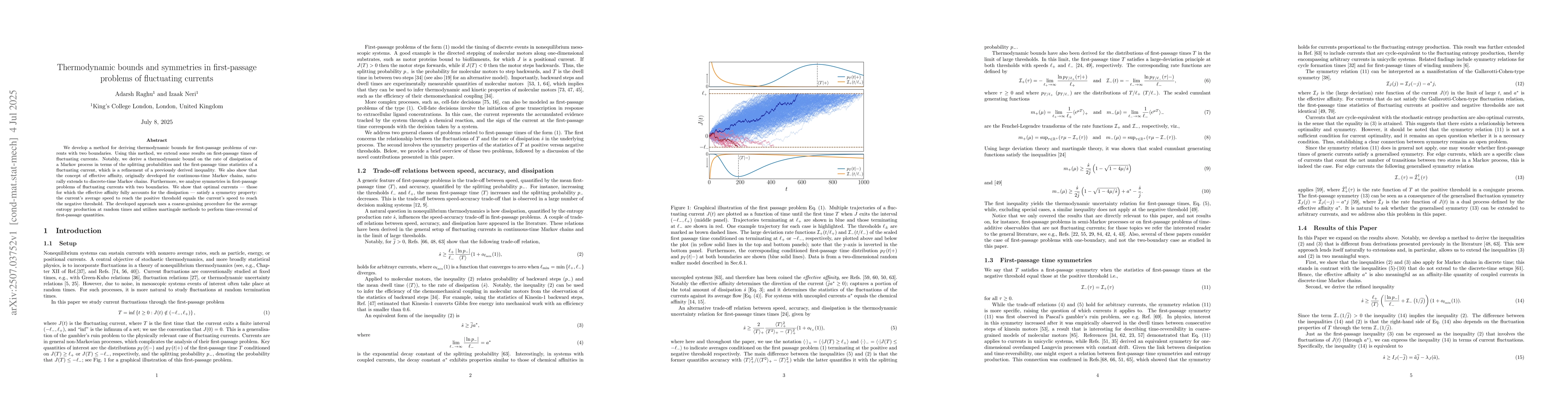 We develop a method for deriving thermodynamic bounds for first-passage problems of currents with two boundaries. Using this method, we extend some results on first-passage times of fluctuating currents. Notably, we derive a thermodynamic bound on the rate of dissipation of a Markov process in terms of the splitting probabilities and the first-passage time statistics of a fluctuating current, which is a refinement of a previously derived inequality. We also show that the concept of effective affinity, originally developed for continuous-time Markov chains, naturally extends to discrete-time Markov chains. Furthermore, we analyse symmetries in first-passage problems of fluctuating currents with two boundaries. We show that optimal currents -- those for which the effective affinity fully accounts for the dissipation -- satisfy a symmetry property: the current's average speed to reach the positive threshold equals the current's speed to reach the negative threshold. The developed approach uses a coarse-graining procedure for the average entropy production at random times and utilises martingale methods to perform time-reversal of first-passage quantities.