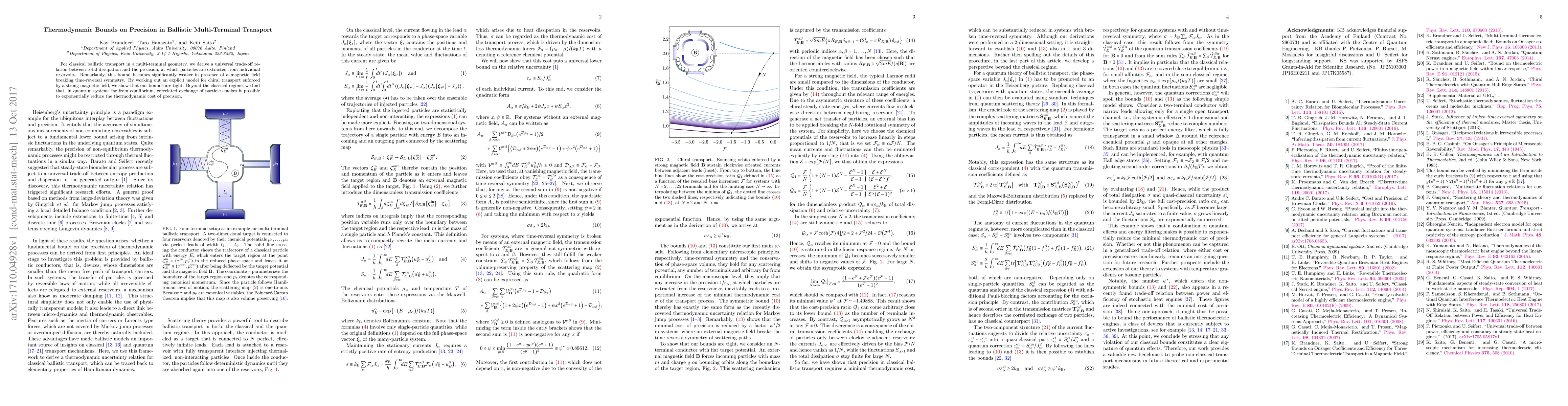 This paper establishes a universal thermodynamic trade-off between dissipation and precision in classical ballistic multi-terminal transport, which weakens in magnetic fields. It also demonstrates that quantum correlations can significantly reduce the thermodynamic cost of precision in non-equilibrium quantum systems.
