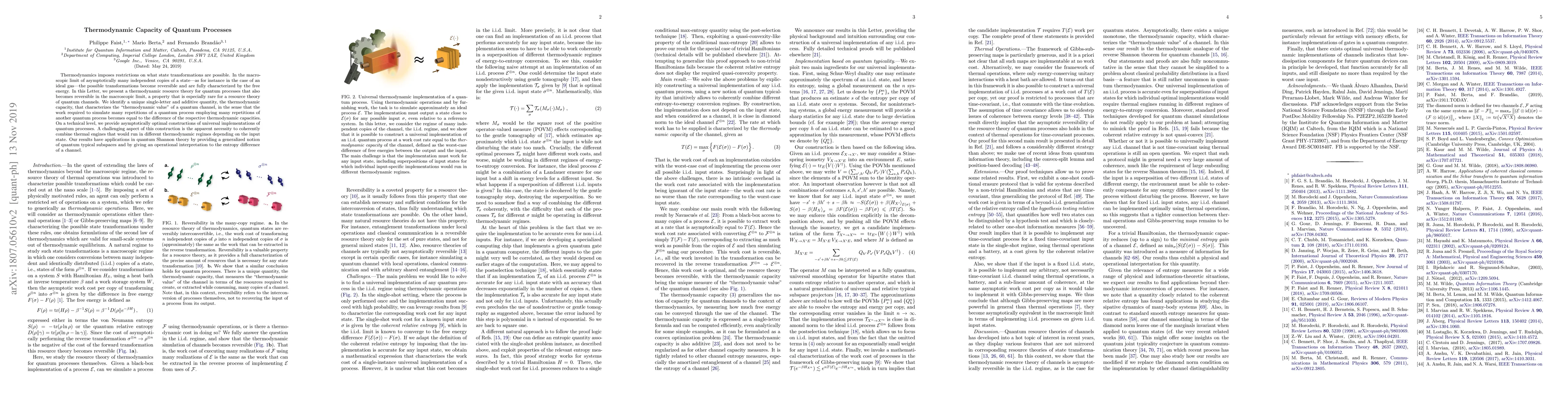 This paper introduces a thermodynamic resource theory for quantum processes, identifying a unique additive thermodynamic capacity that characterizes the reversible work required to simulate quantum channels. It also provides optimal constructions for universal implementations of quantum processes, with implications for quantum Shannon theory.