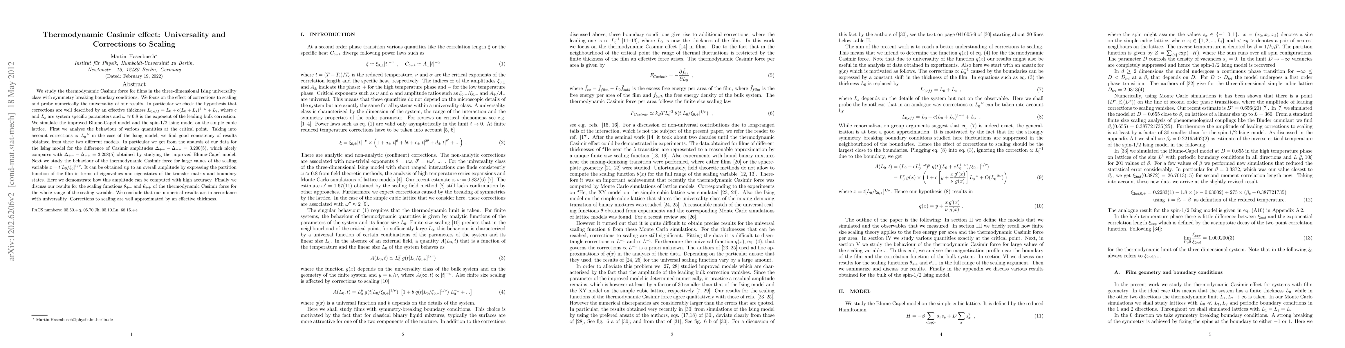We study the thermodynamic Casimir force for films in the three-dimensional Ising universality class with symmetry breaking boundary conditions. We focus on the effect of corrections to scaling and probe numerically the universality of our results. In particular we check our hypothesis that corrections are well described by an effective thickness L_{0,eff}=L_0+c (L_0+L_s)^{1-\omega} +L_s, where c and L_s are system specific parameters and \omega\approx 0.8 is the exponent of the leading bulk correction. We simulate the improved Blume-Capel model and the Ising model on the simple cubic lattice. First we analyse the behaviour of various quantities at the critical point. Taking into account corrections \propto L_0^{-\omega} in the case of the Ising model, we find good consistency of results obtained from these two different models. In particular we get from the analysis of our data for the Ising model for the difference of Casimir amplitudes \Delta_{+-}-\Delta_{++}=3.200(5), which nicely compares with \Delta_{+-}-\Delta_{++}=3.208(5) obtained by studying the improved Blume-Capel model. Next we study the behaviour of the thermodynamic Casimir force for large values of the scaling variable x=t [L_0/\xi_0]. This behaviour can be obtained up to an overall amplitude by expressing the partition function of the film in terms of eigenvalues and eigenstates of the transfermatrix and boundary states. Here we show how this overall amplitude can be computed with high accuracy. Finally we discuss our results for the scaling functions \theta_{+-} and \theta_{++} of the thermodynamic Casimir force for the whole range of the scaling variable. We conclude that our numerical results are in accordance with universality. Corrections to scaling are well approximated by an effective thickness.