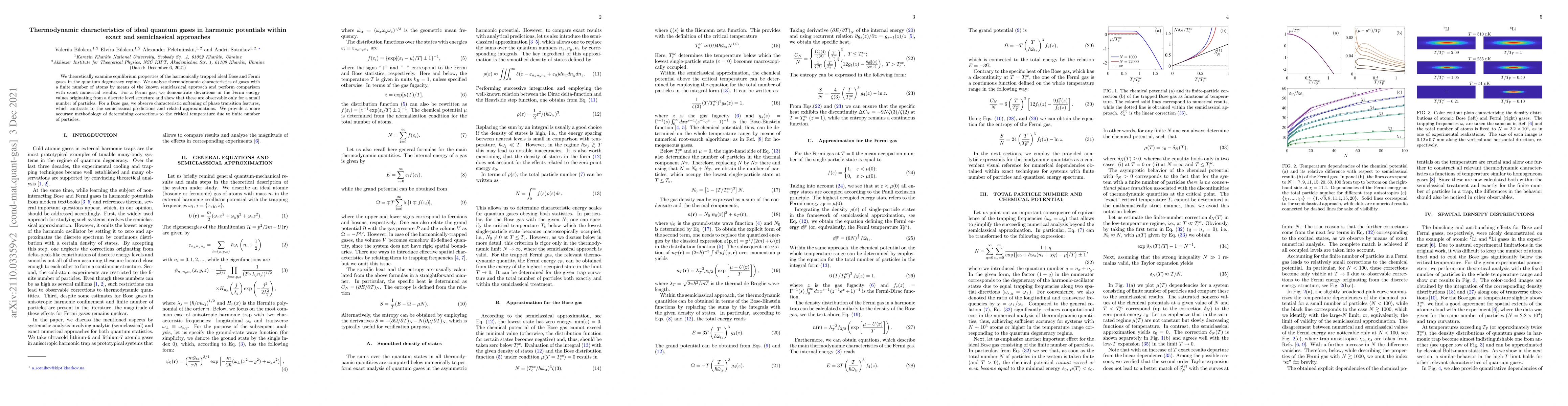 This paper investigates the thermodynamic properties of ideal Bose and Fermi gases trapped in harmonic potentials, comparing semiclassical approximations with exact numerical results. It highlights deviations in Fermi energy for small Fermi gases and softening of phase transition features in Bose gases, proposing a refined method for determining critical temperature corrections.