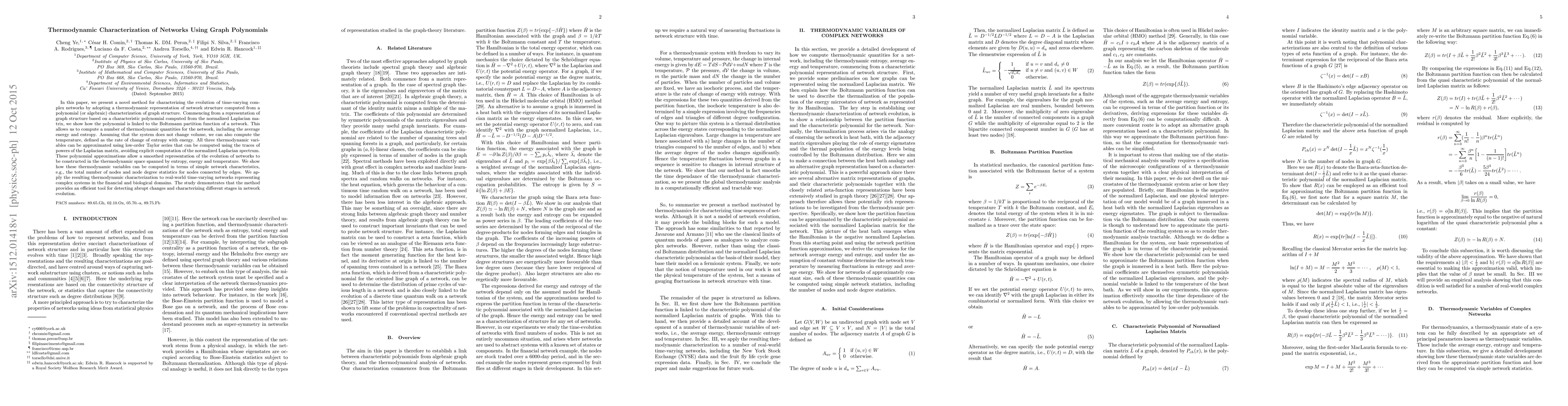 In this paper, we present a method for characterizing the evolution of time-varying complex networks by adopting a thermodynamic representation of network structure computed from a polynomial (or algebraic) characterization of graph structure. Commencing from a representation of graph structure based on a characteristic polynomial computed from the normalized Laplacian matrix, we show how the polynomial is linked to the Boltzmann partition function of a network. This allows us to compute a number of thermodynamic quantities for the network, including the average energy and entropy. Assuming that the system does not change volume, we can also compute the temperature, defined as the rate of change of entropy with energy. All three thermodynamic variables can be approximated using low-order Taylor series that can be computed using the traces of powers of the Laplacian matrix, avoiding explicit computation of the normalized Laplacian spectrum. These polynomial approximations allow a smoothed representation of the evolution of networks to be constructed in the thermodynamic space spanned by entropy, energy, and temperature. We show how these thermodynamic variables can be computed in terms of simple network characteristics, e.g., the total number of nodes and node degree statistics for nodes connected by edges. We apply the resulting thermodynamic characterization to real-world time-varying networks representing complex systems in the financial and biological domains. The study demonstrates that the method provides an efficient tool for detecting abrupt changes and characterizing different stages in network evolution.