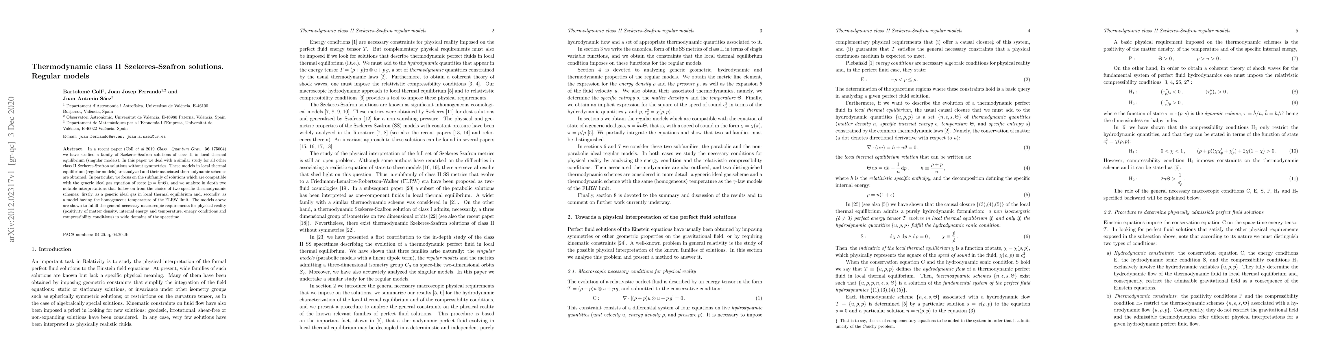 This paper analyzes class II Szekeres-Szafron solutions in local thermal equilibrium, focusing on their thermodynamic schemes and macroscopic requirements for physical reality. The study provides two notable interpretations of these models as a generic ideal gas and a FLRW limit model.
