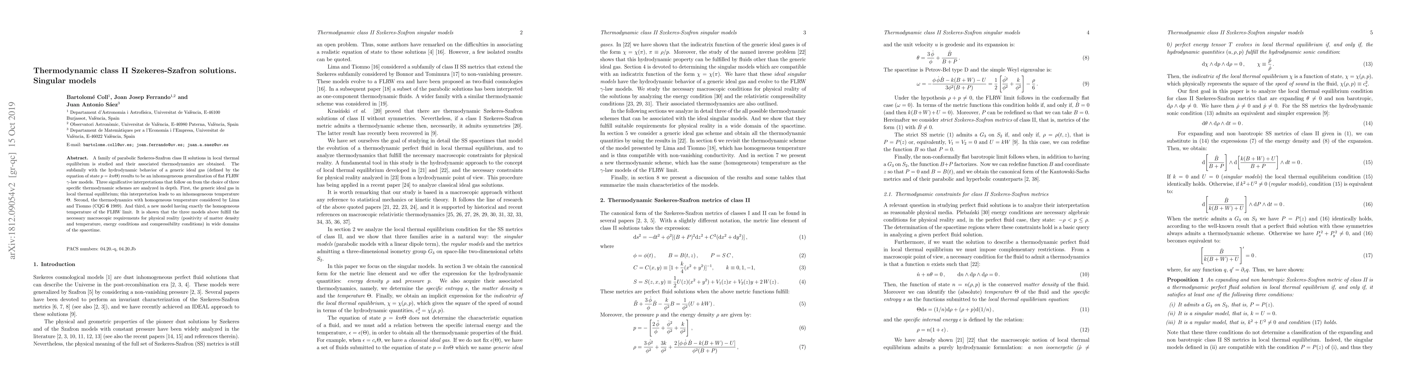 A family of parabolic Szekeres-Szafron class II solutions in local thermal equilibrium is studied and their associated thermodynamics are obtained. The subfamily with the hydrodynamic behavior of a generic ideal gas (defined by the equation of state $p = k n \Theta$) results to be an inhomogeneous generalization of flat FLRW $\gamma$-law models. Three significative interpretations that follow on from the choice of three specific thermodynamic schemes are analyzed in depth. First, the generic ideal gas in local thermal equilibrium; this interpretation leads to an inhomogeneous temperature $\Theta$. Second, the thermodynamics with homogeneous temperature considered by Lima and Tiomno (CQG 6 1989). And third, a new model having exactly the homogeneous temperature of the FLRW limit. It is shown that the three models above fulfill the necessary macroscopic requirements for physical reality (positivity of matter density and temperature, energy conditions and compressibility conditions) in wide domains of the spacetime.