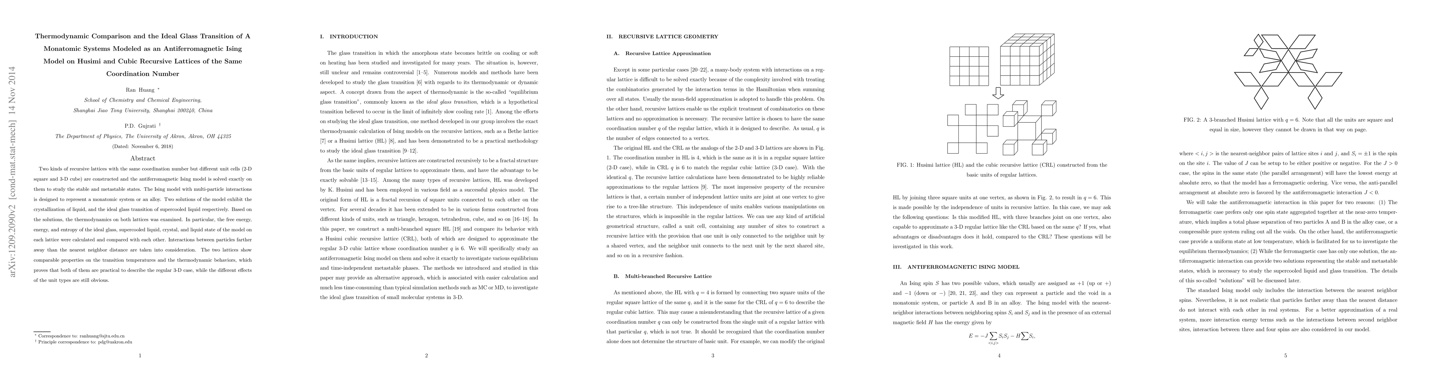 Two kinds of recursive lattices with the same coordination number but different unit cells (2-D square and 3-D cube) are constructed and the antiferromagnetic Ising model is solved exactly on them to study the stable and metastable states. The Ising model with multi-particle interactions is designed to represent a monatomic system or an alloy. Two solutions of the model exhibit the crystallization of liquid, and the ideal glass transition of supercooled liquid respectively. Based on the solutions, the thermodynamics on both lattices was examined. In particular, the free energy, energy, and entropy of the ideal glass, supercooled liquid, crystal, and liquid state of the model on each lattice were calculated and compared with each other. Interactions between particles farther away than the nearest neighbor distance are taken into consideration. The two lattices show comparable properties on the transition temperatures and the thermodynamic behaviors, which proves that both of them are practical to describe the regular 3-D case, while the different effects of the unit types are still obvious.
