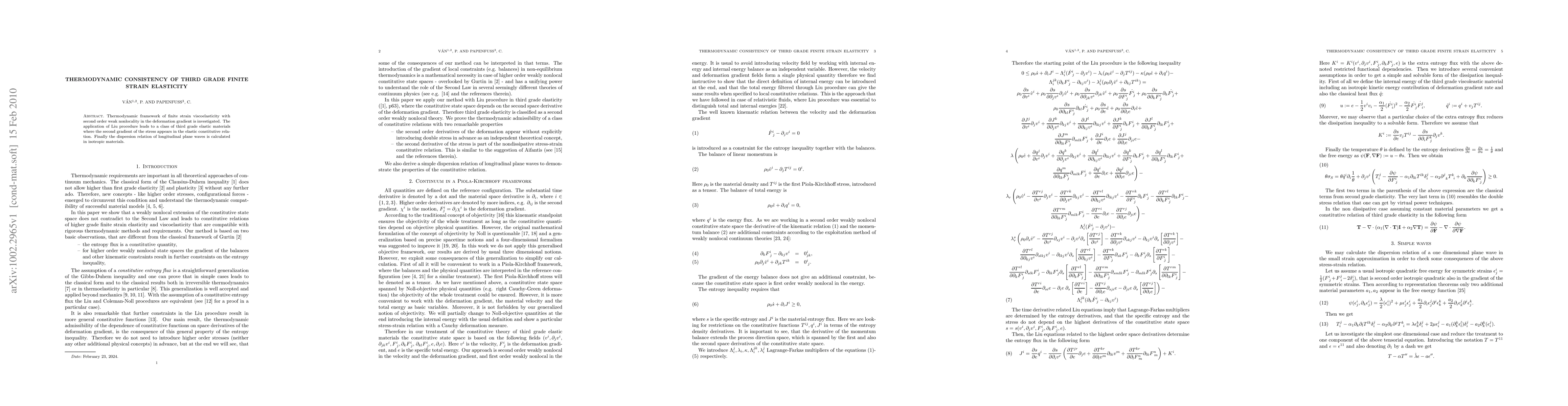 Thermodynamic framework of finite strain viscoelasticity with second order weak nonlocality in the deformation gradient is investigated. The application of Liu procedure leads to a class of third grade elastic materials where the second gradient of the stress appears in the elastic constitutive relation. Finally the dispersion relation of longitudinal plane waves is calculated in isotropic materials.