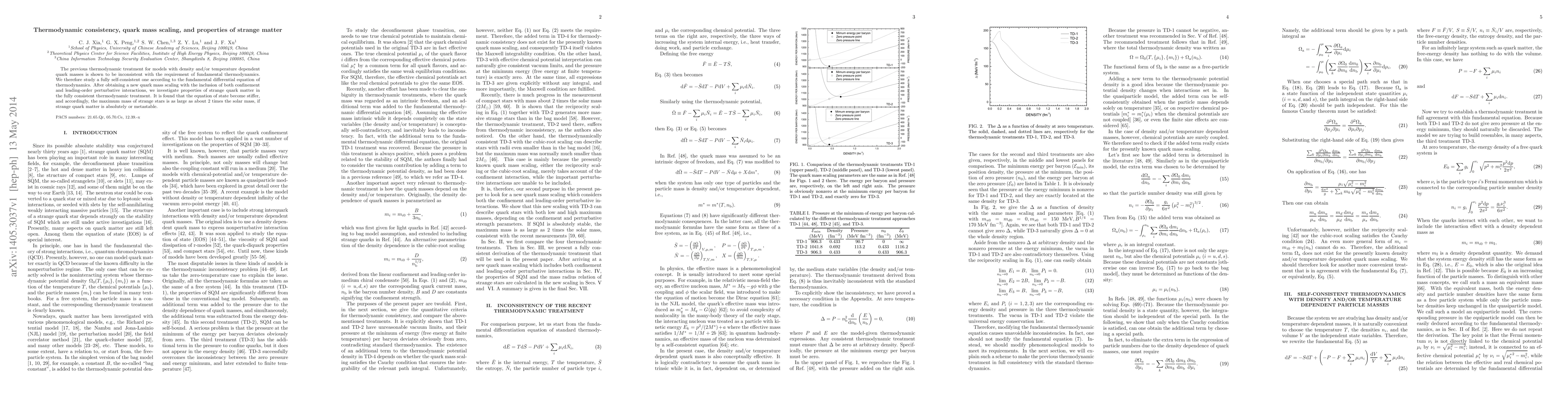 The previous thermodynamic treatment for models with density and/or temperature dependent quark masses is shown to be inconsistent with the requirement of fundamental thermodynamics. We therefore study a fully self-consistent one according to the fundamental differential equation of thermodynamics. After obtaining a new quark mass scaling with the inclusion of both confinement and leading-order perturbative interactions, we investigate properties of strange quark matter in the fully consistent thermodynamic treatment. It is found that the equation of state become stiffer, and accordingly, the maximum mass of strange stars is as large as about 2 times the solar mass, if strange quark matter is absolutely or metastable.