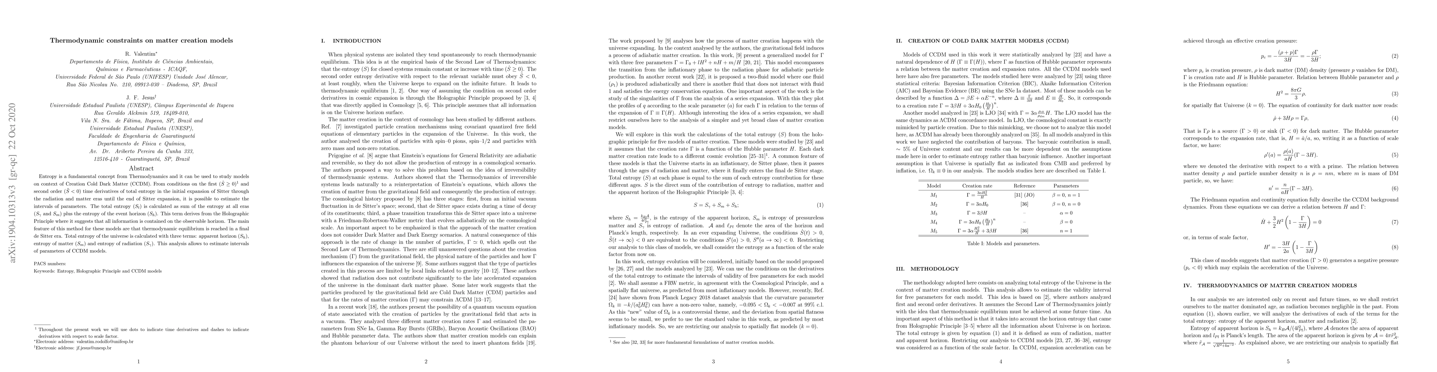 This paper explores thermodynamic constraints on Creation Cold Dark Matter (CCDM) models by analyzing entropy conditions during the universe's expansion from the initial Sitter phase through radiation and matter eras to the end of Sitter expansion. It estimates parameter intervals by considering total entropy, which includes contributions from radiation, matter, and the event horizon.
