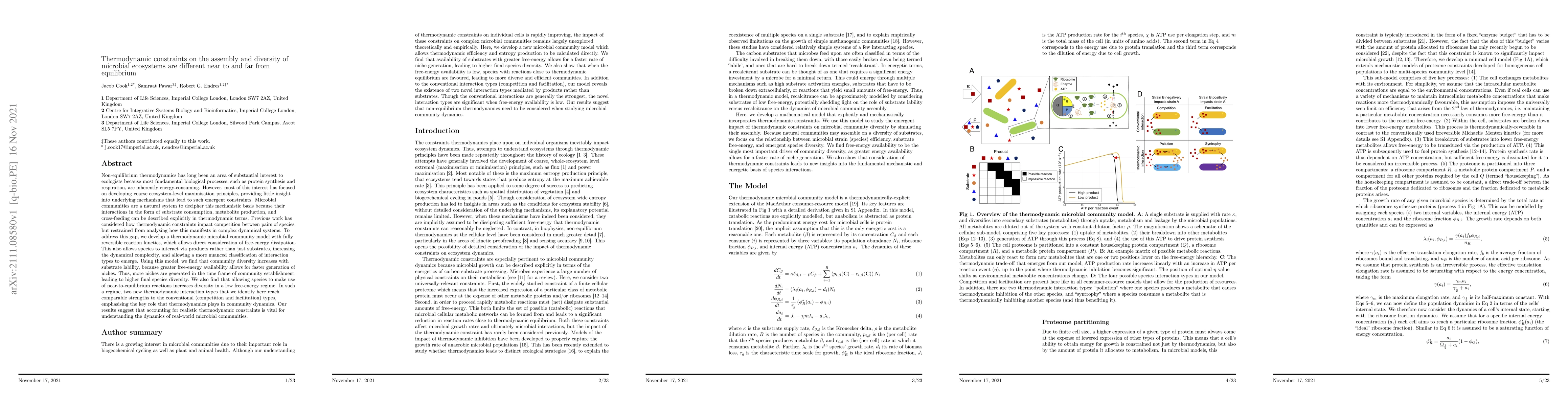 This paper develops a thermodynamic microbial community model to explore how thermodynamic constraints influence microbial ecosystem diversity near and far from equilibrium. The model reveals that community diversity increases with substrate lability and that near-equilibrium reactions significantly boost diversity in low free-energy regimes, highlighting the crucial role of thermodynamics in microbial dynamics.