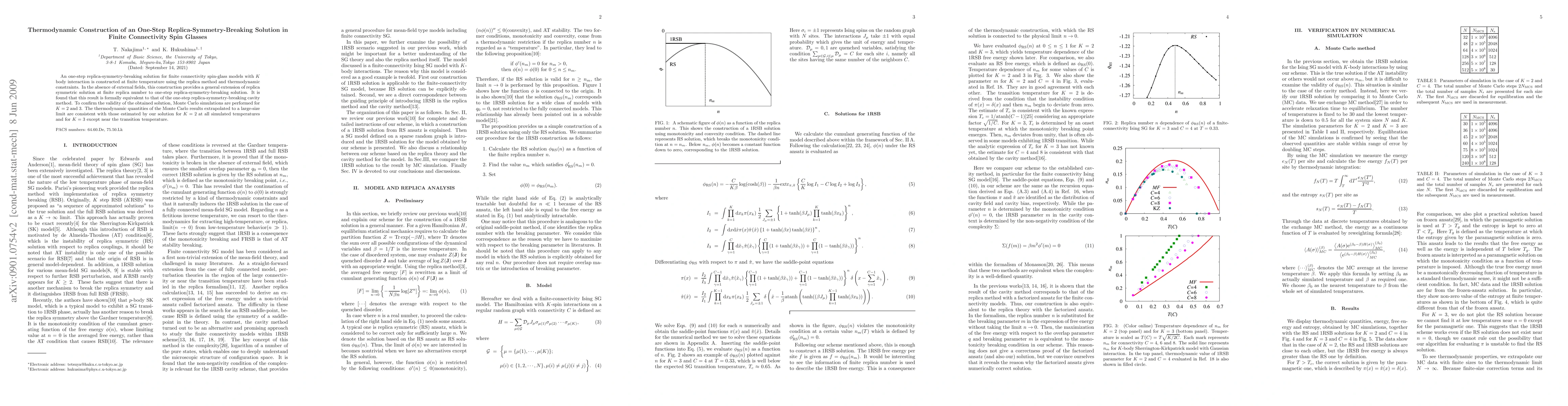 This paper constructs a one-step replica-symmetry-breaking solution for finite connectivity spin-glass models using the replica method and thermodynamic constraints. The solution is validated through Monte Carlo simulations, showing consistency with theoretical predictions for K = 2 and partial agreement for K = 3 near the transition temperature.