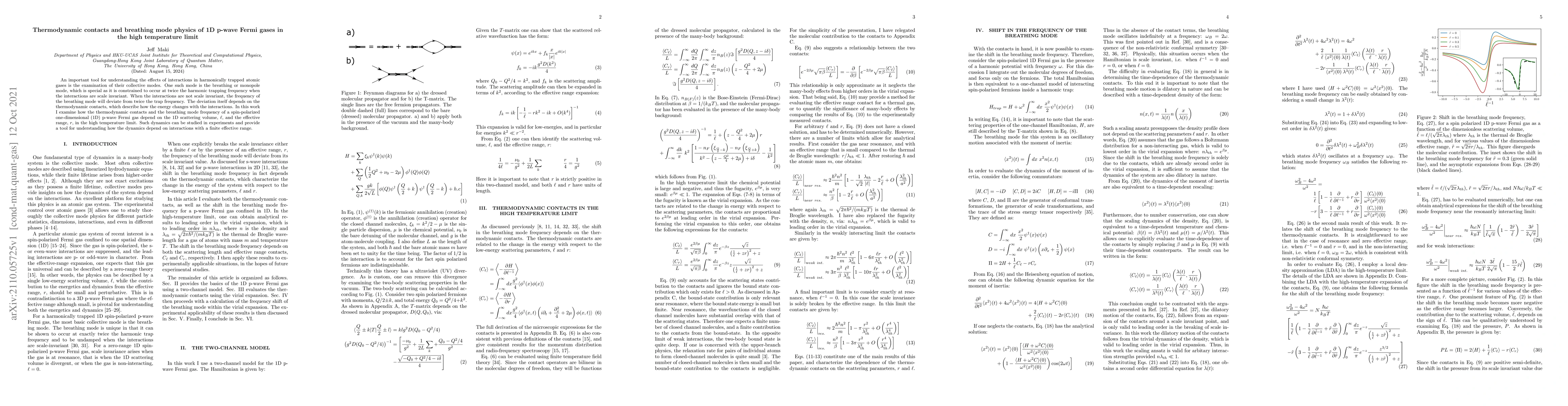 This paper investigates the thermodynamic contacts and breathing mode frequency in high-temperature one-dimensional p-wave Fermi gases, revealing how these properties depend on the 1D scattering volume and effective range, providing insights into interaction dynamics in such systems.