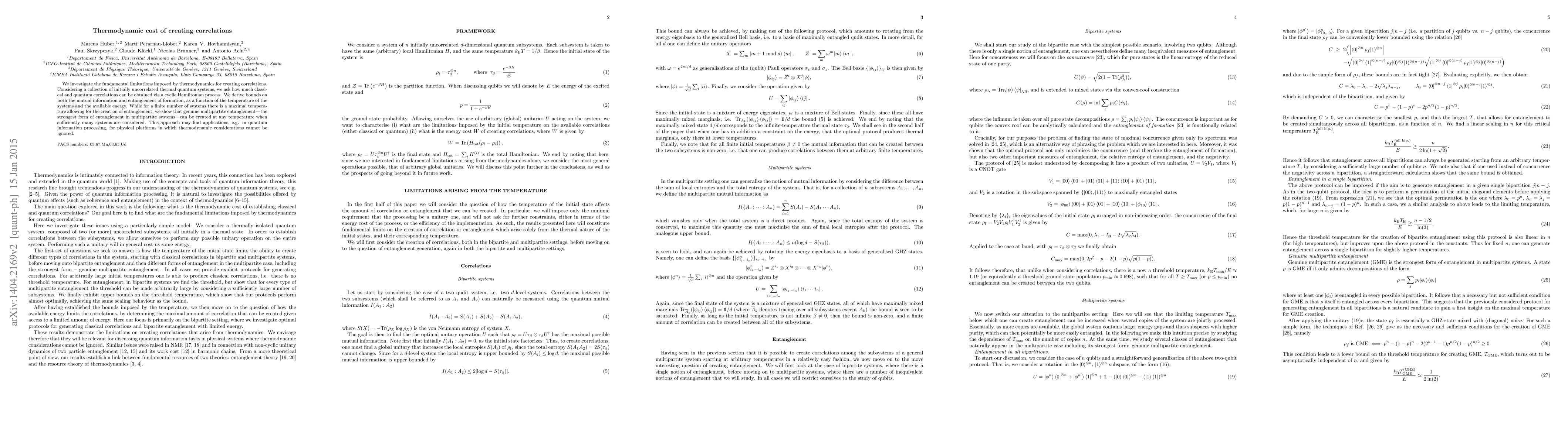 We investigate the fundamental limitations imposed by thermodynamics for creating correlations. Considering a collection of initially uncorrelated thermal quantum systems, we ask how much classical and quantum correlations can be obtained via a cyclic Hamiltonian process. We derive bounds on both the mutual information and entanglement of formation, as a function of the temperature of the systems and the available energy. While for a finite number of systems there is a maximal temperature allowing for the creation of entanglement, we show that genuine multipartite entanglement---the strongest form of entanglement in multipartite systems---can be created at any temperature when sufficiently many systems are considered. This approach may find applications, e.g. in quantum information processing, for physical platforms in which thermodynamic considerations cannot be ignored.