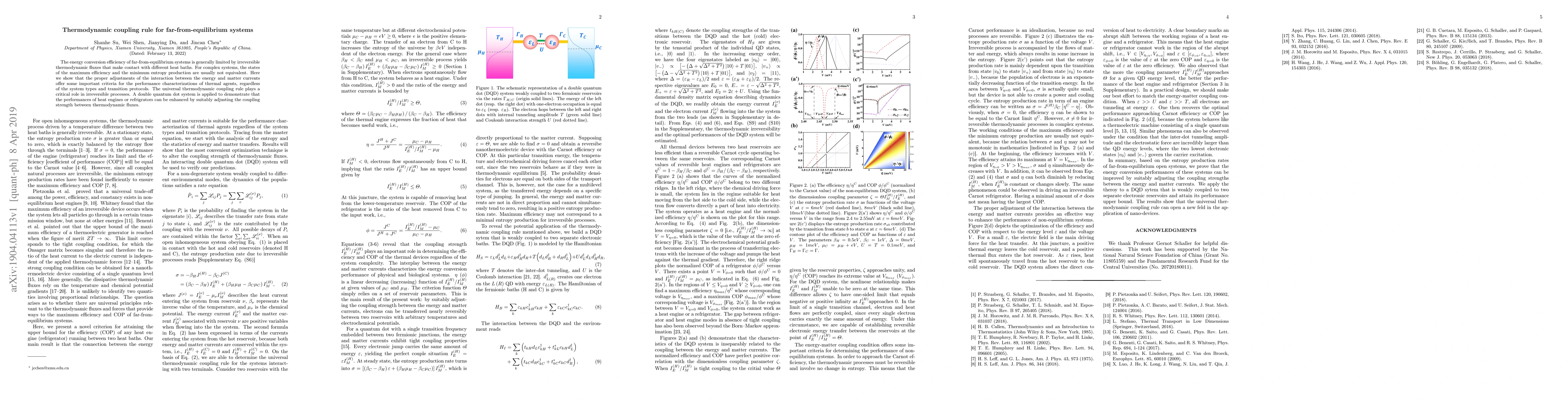 The energy conversion efficiency of far-from-equilibrium systems is generally limited by irreversible thermodynamic fluxes that make contact with different heat baths. For complex systems, the states of the maximum efficiency and the minimum entropy production are usually not equivalent. Here we show that the proper adjustments of the interaction between the energy and matter currents offer some important criteria for the performance characterizations of thermal agents, regardless of the system types and transition protocols. The universal thermodynamic coupling rule plays a critical role in irreversible processes. A double quantum dot system is applied to demonstrate that the performances of heat engines or refrigrators can be enhanced by suitably adjusting the coupling strength between thermodynamic fluxes.