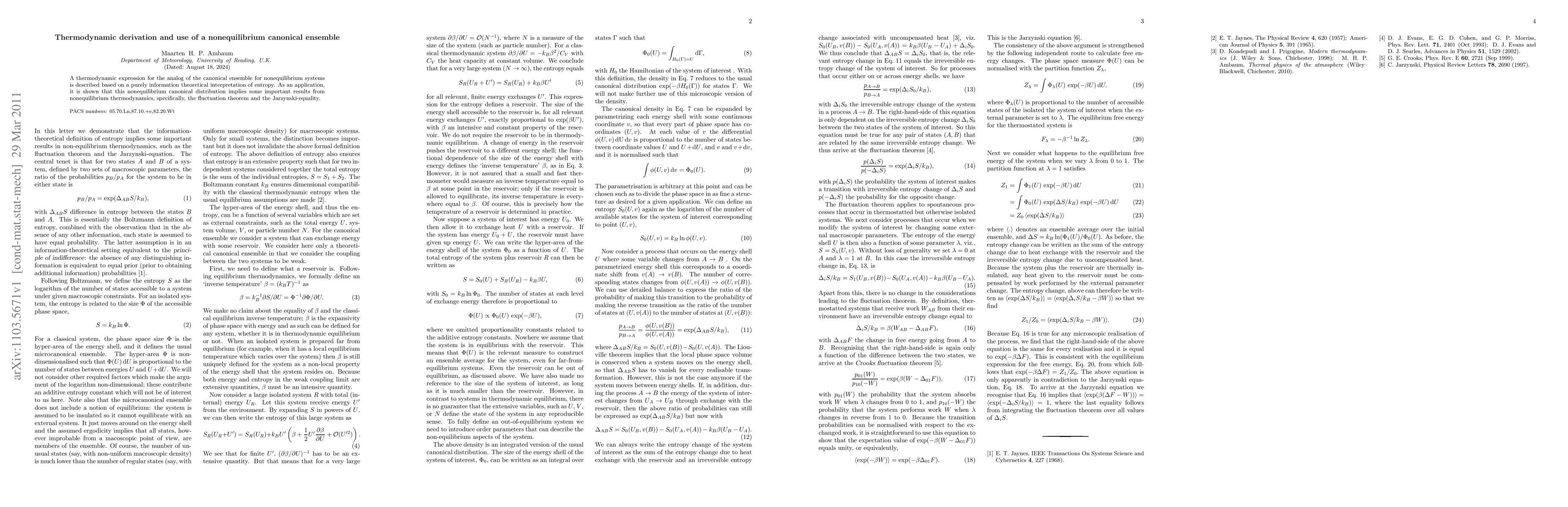 A thermodynamic expression for the analog of the canonical ensemble for nonequilibrium systems is described based on a purely information theoretical interpretation of entropy. As an application, it is shown that this nonequilibrium canonical distribution implies some important results from nonequilibrium thermodynamics, specifically, the fluctuation theorem and the Jarzynski-equality.