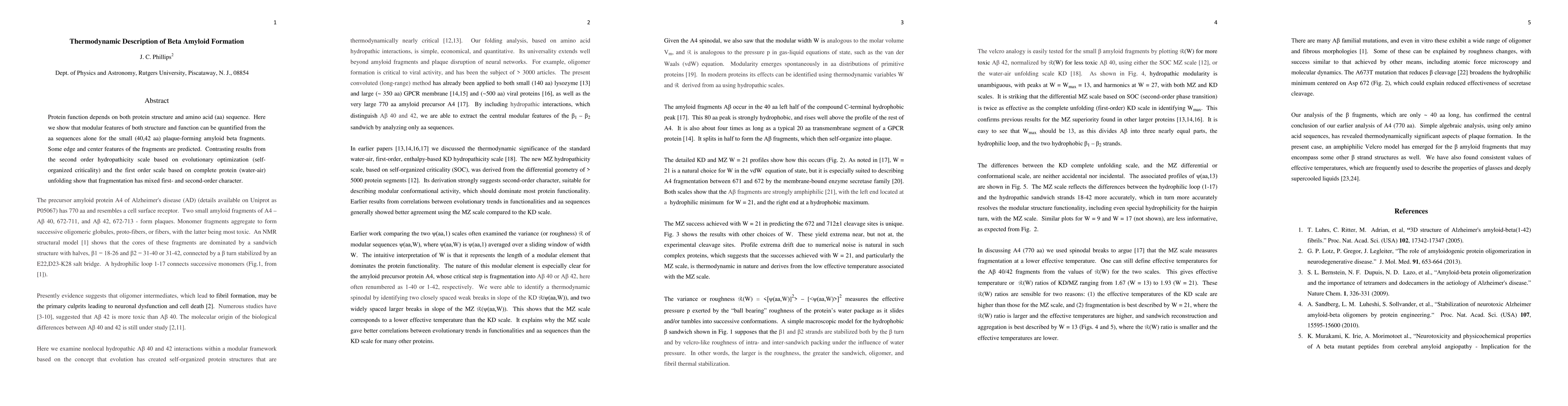 Protein function depends on both protein structure and amino acid (aa) sequence. Here we show that modular features of both structure and function can be quantified from the aa sequences alone for the small (40,42 aa) plaque-forming amyloid beta fragments. Some edge and center features of the fragments are predicted. Contrasting results from the second order hydropathicity scale based on evolutionary optimization (self-organized criticality) and the first order scale based on complete protein (water-air) unfolding show that fragmentation has mixed first- and second-order character.