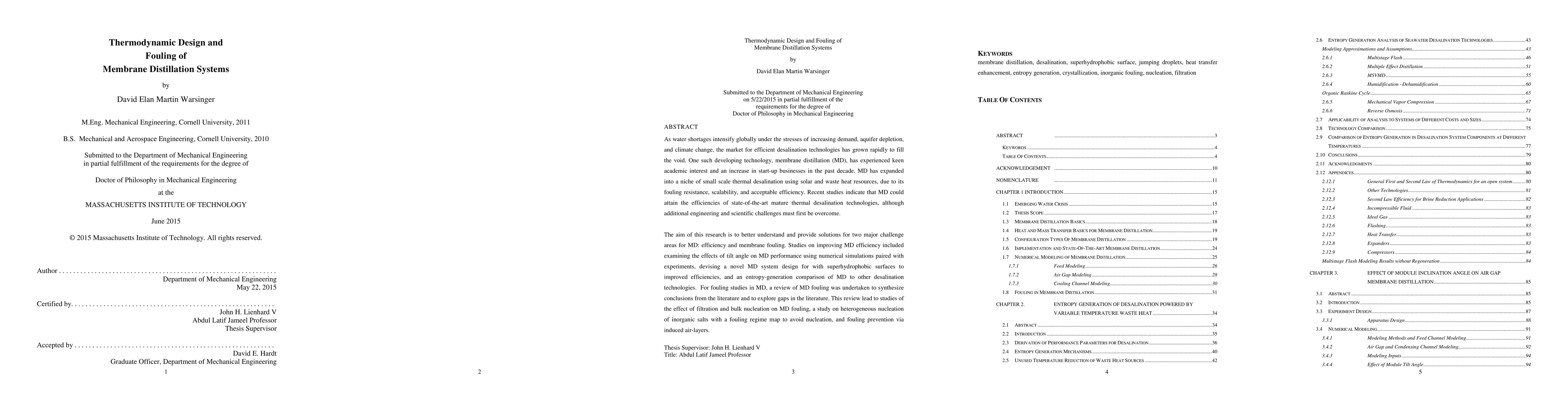 This research investigates the thermodynamic design and fouling challenges of membrane distillation (MD) systems, focusing on improving efficiency through novel designs and entropy-generation comparisons, and addressing fouling via comprehensive literature reviews and experimental studies on nucleation and air-layer fouling prevention.