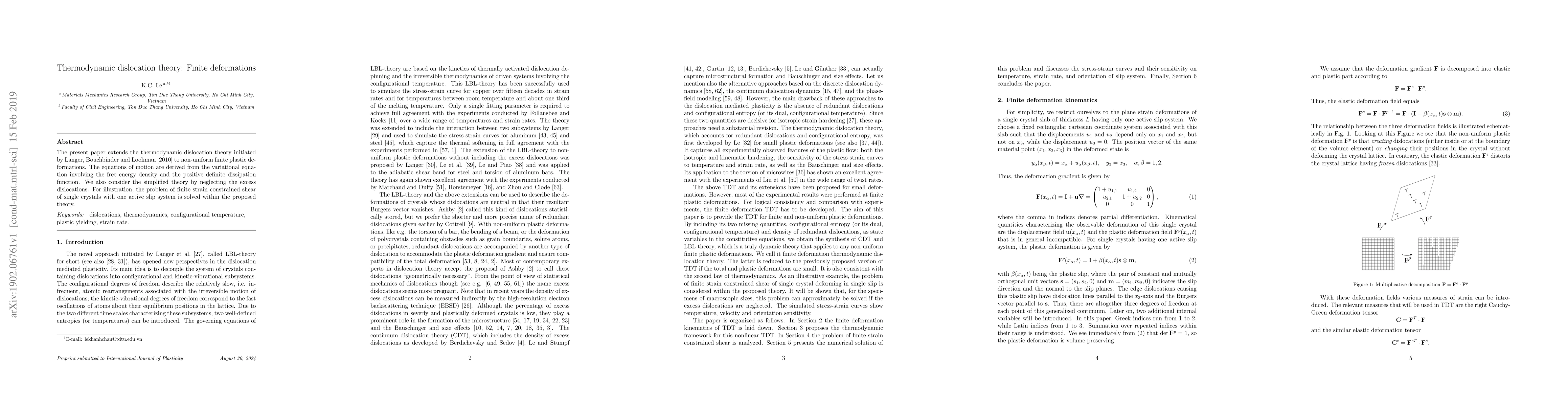 The present paper extends the thermodynamic dislocation theory initiated by Langer, Bouchbinder and Lookman [2010] to non-uniform finite plastic deformations. The equations of motion are derived from the variational equation involving the free energy density and the positive definite dissipation function. We also consider the simplified theory by neglecting the excess dislocations. For illustration, the problem of finite strain constrained shear of single crystals with one active slip system is solved within the proposed theory.