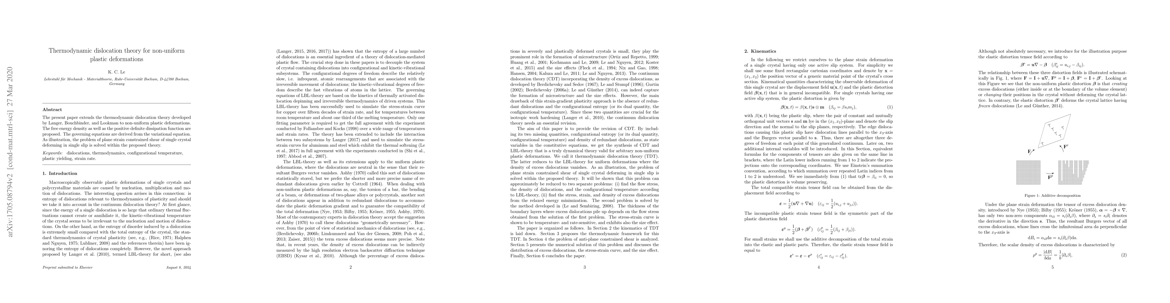 The present paper extends the thermodynamic dislocation theory developed by Langer, Bouchbinder, and Lookmann to non-uniform plastic deformations. The free energy density as well as the positive definite dissipation function are proposed. The governing equations are derived from the variational equation. As illustration, the problem of plane strain constrained shear of single crystal deforming in single slip is solved within the proposed theory.