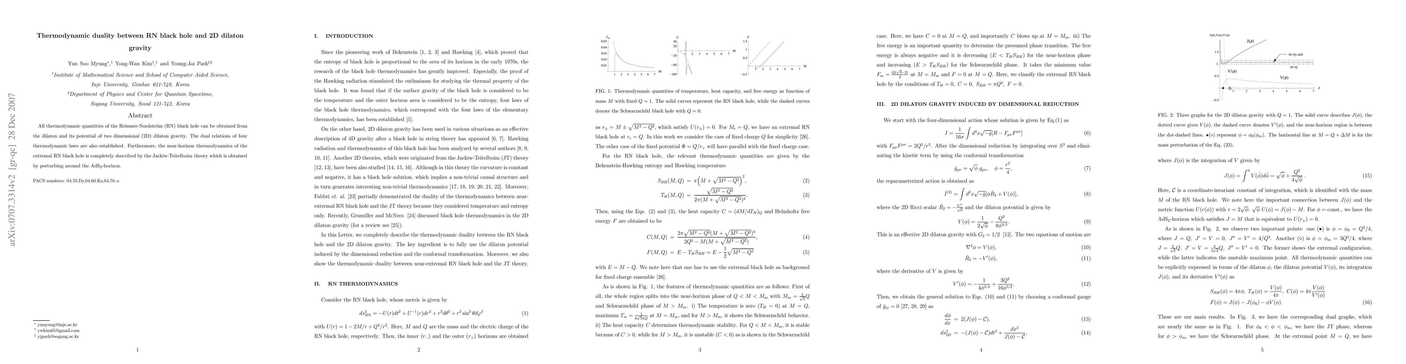 All thermodynamic quantities of the Reissner-Nordstr\"om (RN) black hole can be obtained from the dilaton and its potential of two dimensional (2D) dilaton gravity. The dual relations of four thermodynamic laws are also established. Furthermore, the near-horizon thermodynamics of the extremal RN black hole is completely described by the Jackiw-Teitelboim theory which is obtained by perturbing around the AdS$_2$-horizon.