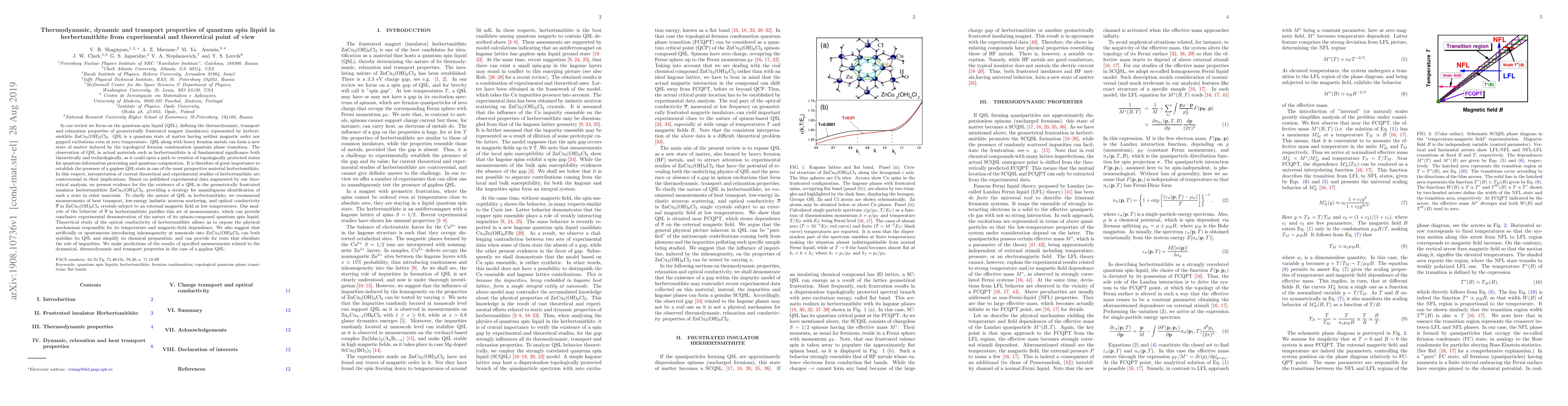 Summary: This review explores the thermodynamic, dynamic, and transport properties of the quantum spin liquid in herbertsmithite, a geometrically frustrated magnet, through both experimental observations and theoretical analysis. The study emphasizes the unique characteristics of this material as an insulator.