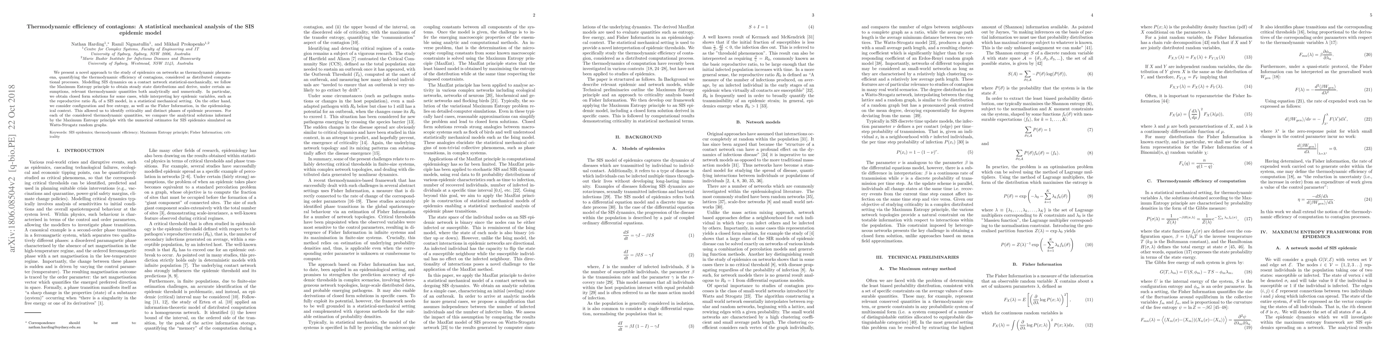 We present a novel approach to the study of epidemics on networks as thermodynamic phenomena, considering the thermodynamic efficiency of contagions, considered as distributed computational processes. Modelling SIS dynamics on a contact network statistical-mechanically, we follow the Maximum Entropy principle to obtain steady state distributions and derive, under certain assumptions, relevant thermodynamic quantities both analytically and numerically. In particular, we obtain closed form solutions for some cases, while interpreting key epidemic variables, such as the reproductive ratio $R_0$ of a SIS model, in a statistical mechanical setting. On the other hand, we consider configuration and free entropy, as well as the Fisher Information, in the epidemiological context. This allowed us to identify criticality and distinct phases of epidemic processes. For each of the considered thermodynamic quantities, we compare the analytical solutions informed by the Maximum Entropy principle with the numerical estimates for SIS epidemics simulated on Watts-Strogatz random graphs.