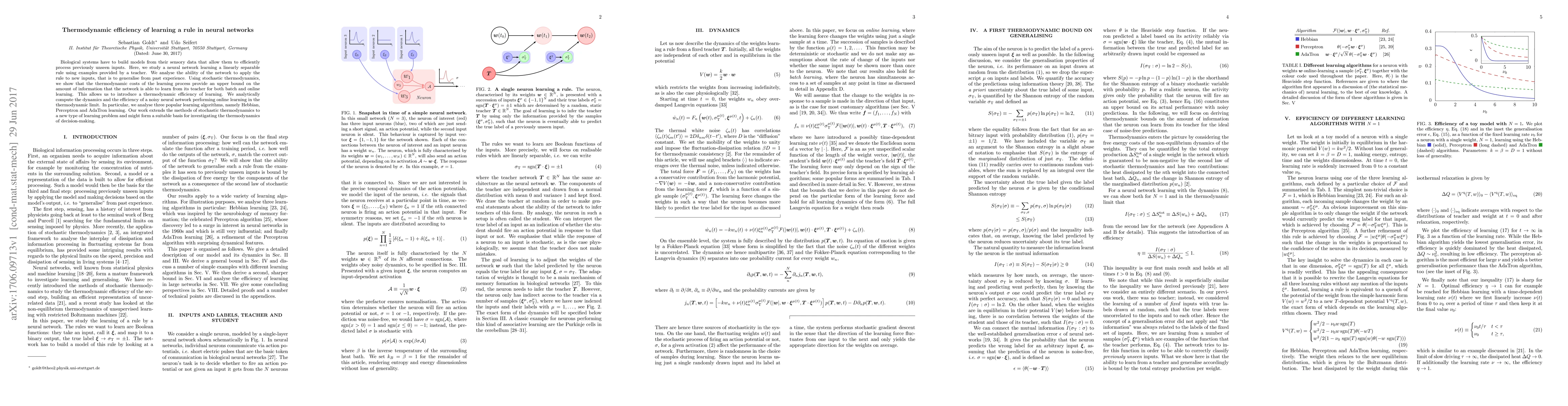 Biological systems have to build models from their sensory data that allow them to efficiently process previously unseen inputs. Here, we study a neural network learning a linearly separable rule using examples provided by a teacher. We analyse the ability of the network to apply the rule to new inputs, that is to generalise from past experience. Using stochastic thermodynamics, we show that the thermodynamic costs of the learning process provide an upper bound on the amount of information that the network is able to learn from its teacher for both batch and online learning. This allows us to introduce a thermodynamic efficiency of learning. We analytically compute the dynamics and the efficiency of a noisy neural network performing online learning in the thermodynamic limit. In particular, we analyse three popular learning algorithms, namely Hebbian, Perceptron and AdaTron learning. Our work extends the methods of stochastic thermodynamics to a new type of learning problem and might form a suitable basis for investigating the thermodynamics of decision-making.