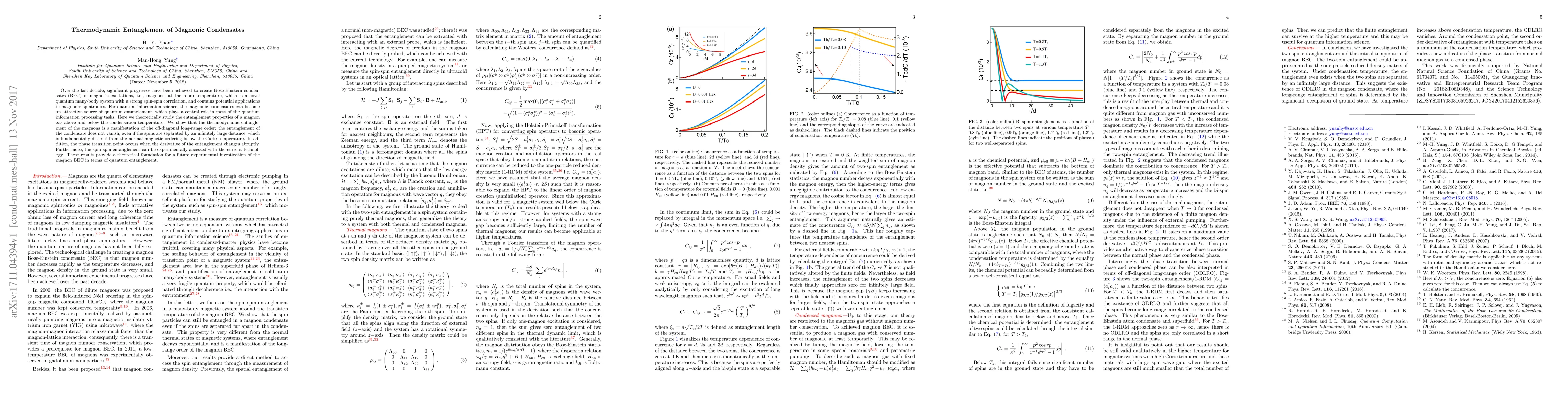 Over the last decade, significant progresses have been achieved to create Bose-Einstein condensates (BEC) of magnetic excitations, i.e., magnons, at the room temperature, which is a novel quantum many-body system with a strong spin-spin correlation, and contains potential applications in magnonic spintronics. For quantum information science, the magnonic condensates can become an attractive source of quantum entanglement, which plays a central role in most of the quantum information processing tasks. Here we theoretically study the entanglement properties of a magnon gas above and below the condensation temperature. We show that the thermodynamic entanglement of the magnons is a manifestation of the off-diagonal long-range order; the entanglement of the condensate does not vanish, even if the spins are separated by an infinitely large distance, which is fundamentally distinct from the normal magnetic ordering below the Curie temperature. In addition, the phase transition point occurs when the derivative of the entanglement changes abruptly. Furthermore, the spin-spin entanglement can be experimentally accessed with the current technology. These results provide a theoretical foundation for a future experimental investigation of the magnon BEC in terms of quantum entanglement.