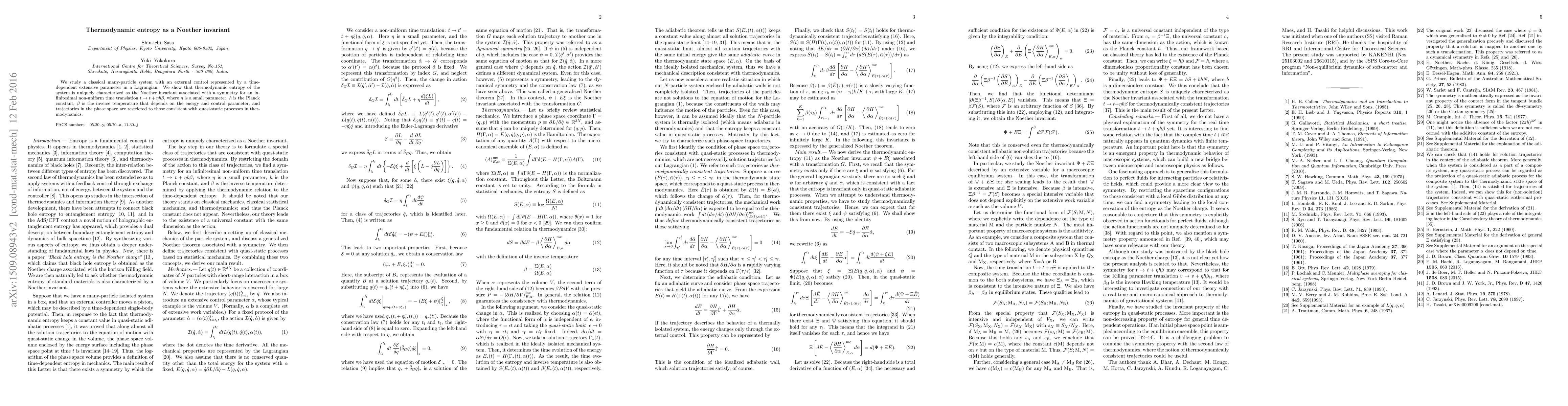 We study a classical many-particle system with an external control represented by a time-dependent extensive parameter in a Lagrangian. We show that thermodynamic entropy of the system is uniquely characterized as the Noether invariant associated with a symmetry for an infinitesimal non-uniform time translation $t\to t+\eta\hbar \beta$, where $\eta$ is a small parameter, $\hbar$ is the Planck constant, $\beta$ is the inverse temperature that depends on the energy and control parameter, and trajectories in the phase space are restricted to those consistent with quasi-static processes in thermodynamics.