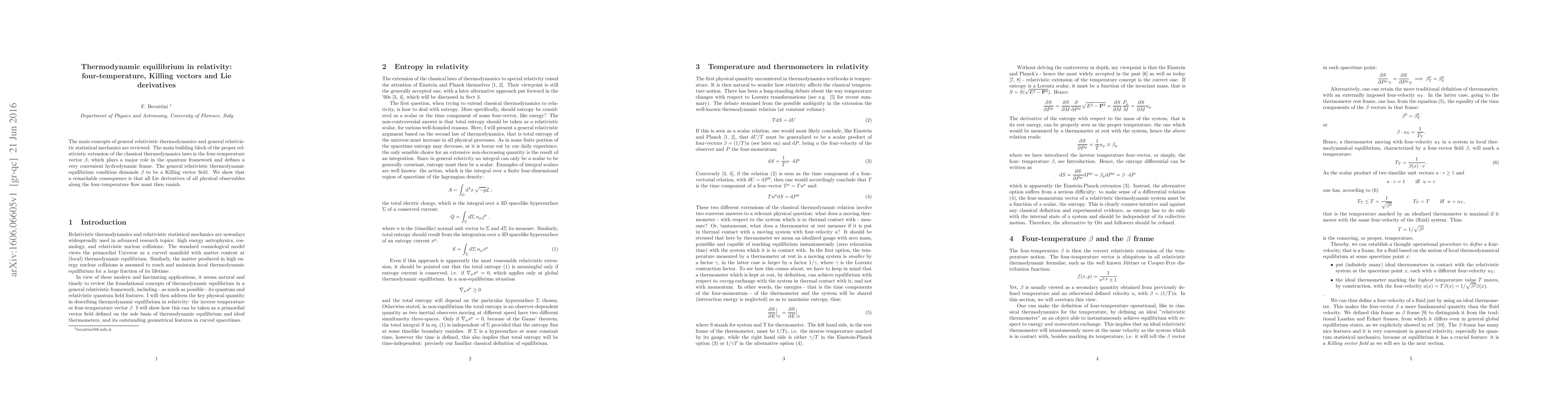 The main concepts of general relativistic thermodynamics and general relativistic statistical mechanics are reviewed. The main building block of the proper relativistic extension of the classical thermodynamics laws is the four-temperature vector \beta, which plays a major role in the quantum framework and defines a very convenient hydrodynamic frame. The general relativistic thermodynamic equilibrium condition demands \beta to be a Killing vector field. We show that a remarkable consequence is that all Lie derivatives of all physical observables along the four-temperature flow must then vanish.