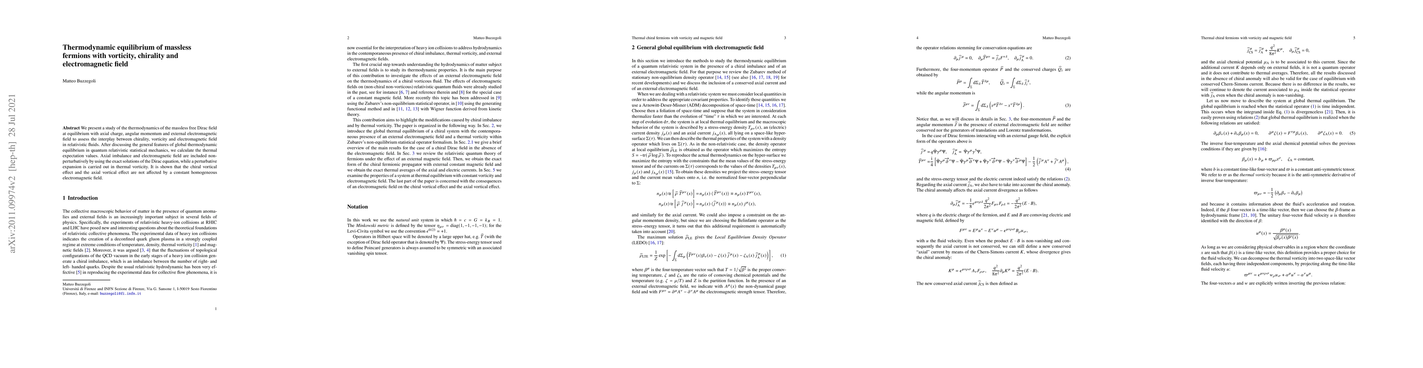 We present a study of the thermodynamics of the massless free Dirac field at equilibrium with axial charge, angular momentum and and external electromagnetic field to assess the interplay between chirality, vorticity and electromagnetic field in relativistic fluids. After discussing the general features of global thermodynamic equilibrium in quantum relativistic statistical mechanics, we calculate the thermal expectation values. Axial imbalance and electromagnetic field are included non-perturbatively by using the exact solutions of the Dirac equation, while a perturbative expansion is carried out in thermal vorticity. It is shown that the chiral vortical effect and the axial vortical effect are not affected by a constant homogeneous electromagnetic field.
