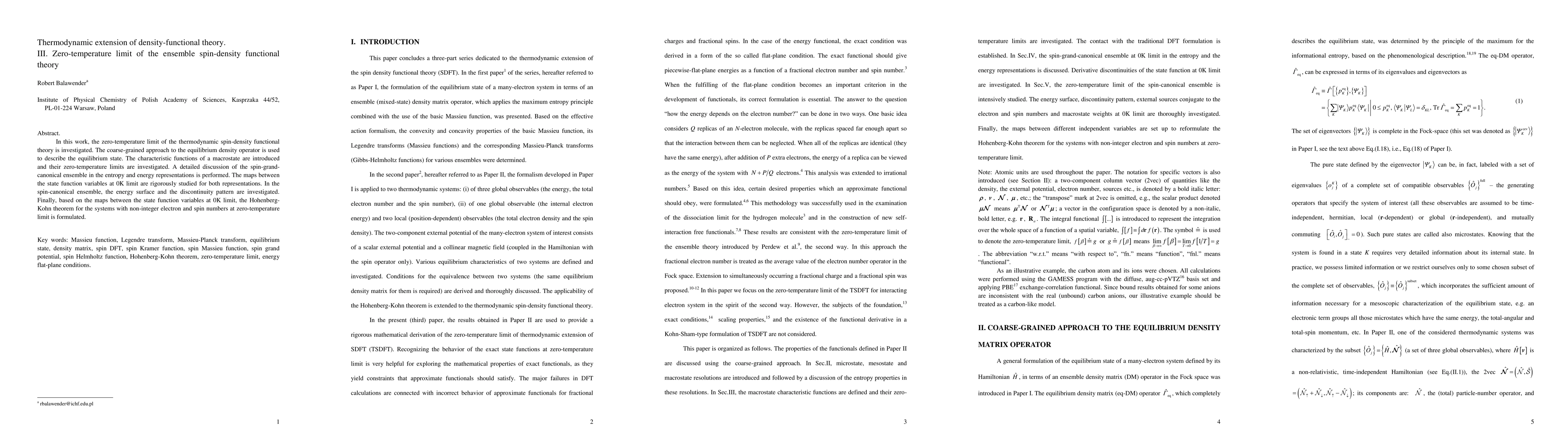 In this work, the zero-temperature limit of the thermodynamic spin-density functional theory is investigated. The coarse-grained approach to the equilibrium density operator is used to describe the equilibrium state. The characteristic functions of a macrostate are introduced and their zero-temperature limits are investigated. A detailed discussion of the spin-grand-canonical ensemble in the entropy and energy representations is performed. The maps between the state function variables at 0K limit are rigorously studied for both representations. In the spin-canonical ensemble, the energy surface and the discontinuity pattern are investigated. Finally, based on the maps between the state function variables at 0K limit, the Hohenberg-Kohn theorem for the systems with non-integer electron and spin numbers at zero-temperature limit is formulated.