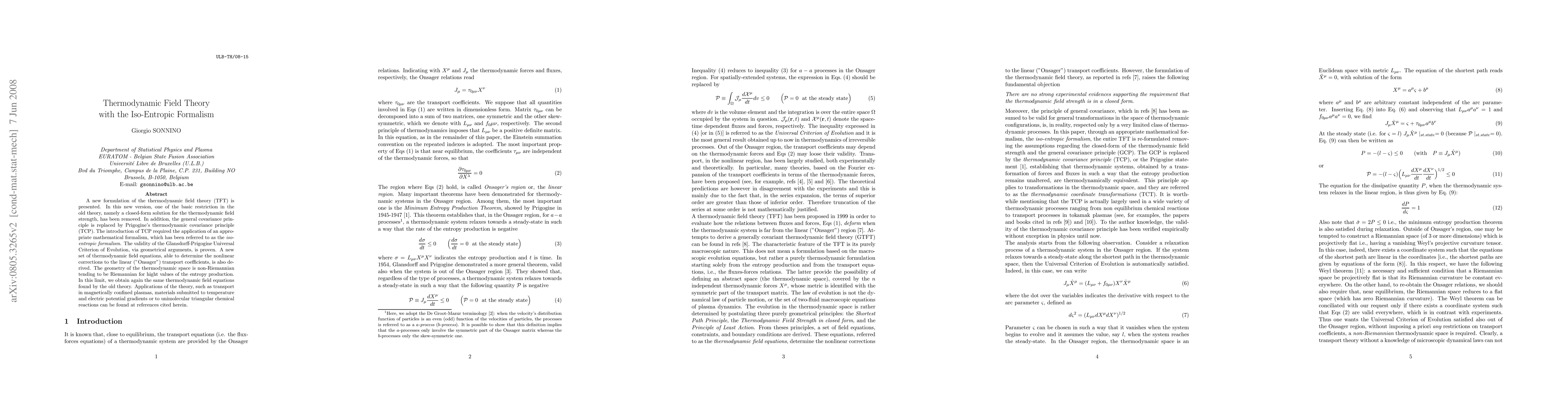 This paper introduces a novel thermodynamic field theory (TFT) that removes the closed-form solution restriction and replaces general covariance with Prigogine's thermodynamic covariance principle (TCP). The new iso-entropic formalism validates the Glansdorff-Prigogine Universal Criterion of Evolution and derives a set of field equations for nonlinear transport coefficient corrections.