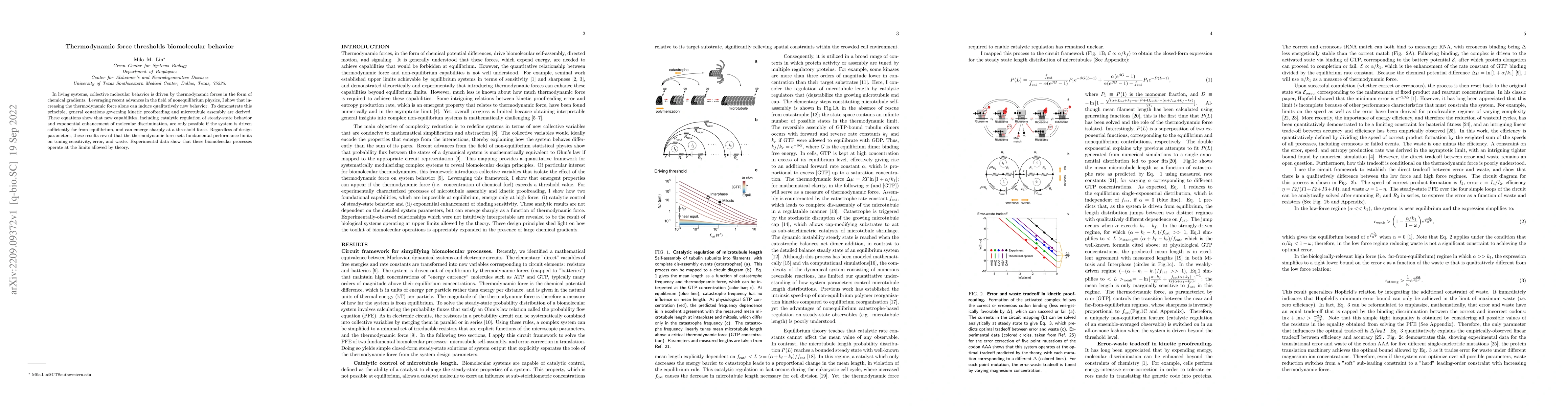 In living systems, collective molecular behavior is driven by thermodynamic forces in the form of chemical gradients. Leveraging recent advances in the field of nonequilibrium physics, I show that increasing the thermodynamic force alone can induce qualitatively new behavior. To demonstrate this principle, general equations governing kinetic proofreading and microtubule assembly are derived. These equations show that new capabilities, including catalytic regulation of steady-state behavior and exponential enhancement of molecular discrimination, are only possible if the system is driven sufficiently far from equilibrium, and can emerge sharply at a threshold force. Regardless of design parameters, these results reveal that the thermodynamic force sets fundamental performance limits on tuning sensitivity, error, and waste. Experimental data show that these biomolecular processes operate at the limits allowed by theory.