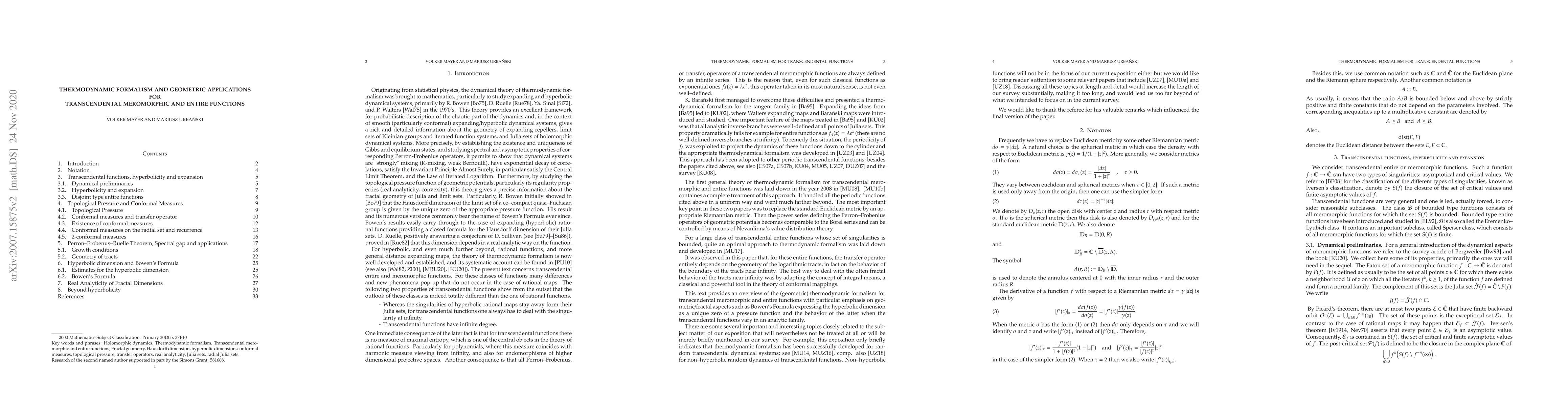 This paper explores the thermodynamic formalism for transcendental meromorphic and entire functions, focusing on geometric/fractal aspects, including Bowen's Formula for hyperbolic dimension and the pressure function's behavior in analytic families.