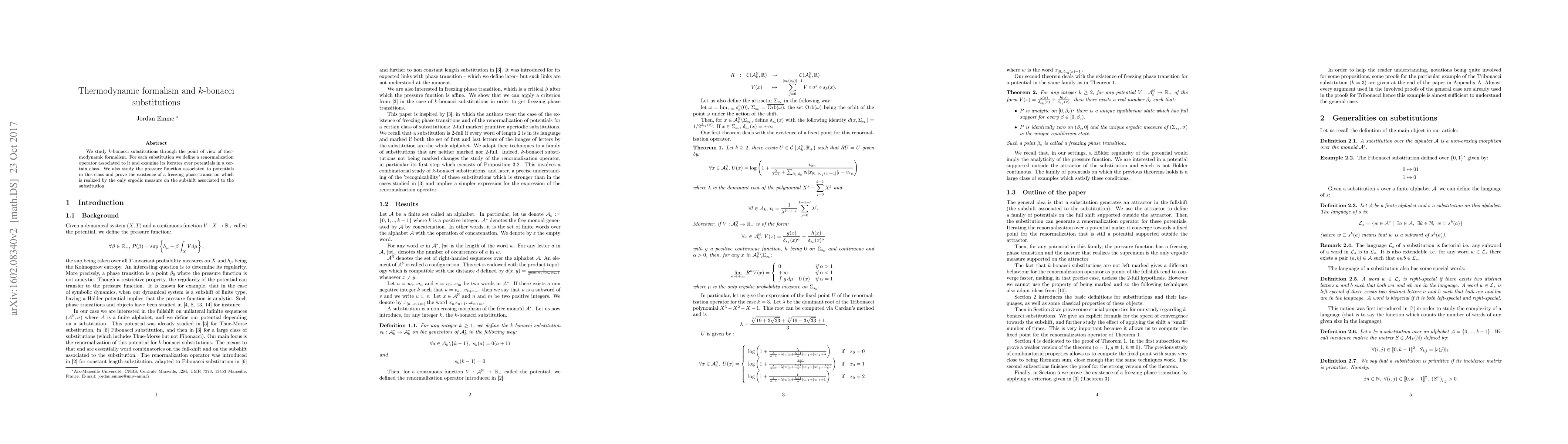 We study $k$-bonacci substitutions. For each we define a renormalization operator associated to it and examine its iterates over potentials in a certain class. We also study the pressure function associated to potentials in this class and prove the existence of a freezing phase transition which is realized by the only ergodic measure on the subshift associated to the substitution.