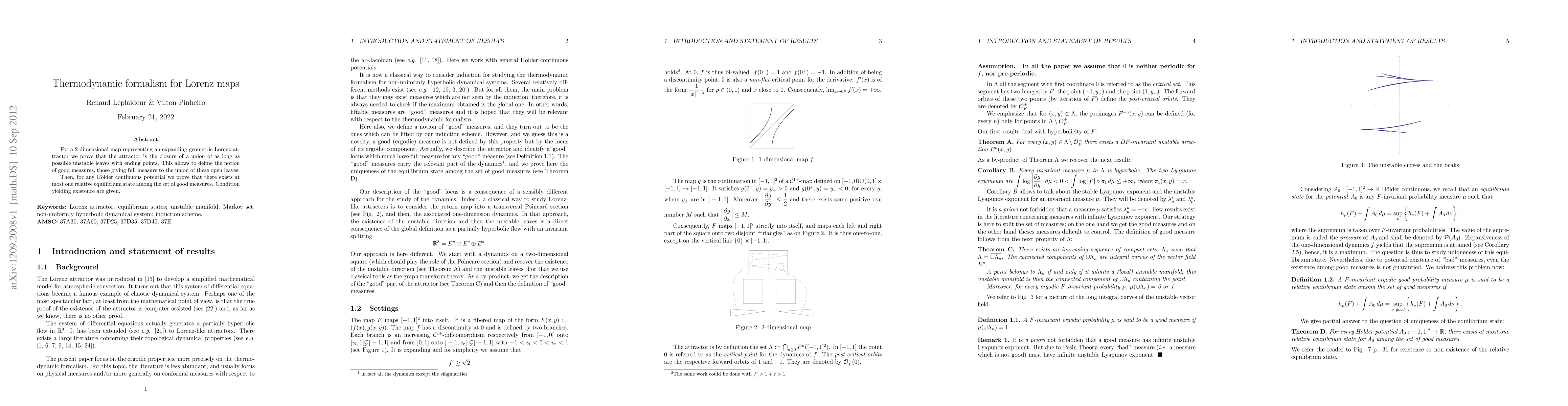 For a 2-dimensional map representing an expanding geometric Lorenz at- tractor we prove that the attractor is the closure of a union of as long as possible unstable leaves with ending points. This allows to define the notion of good measures, those giving full measure to the union of these open leaves. Then, for any H\"older continuous potential we prove that there exists at most one relative equilibrium state among the set of good measures. Condition yielding existence are given.