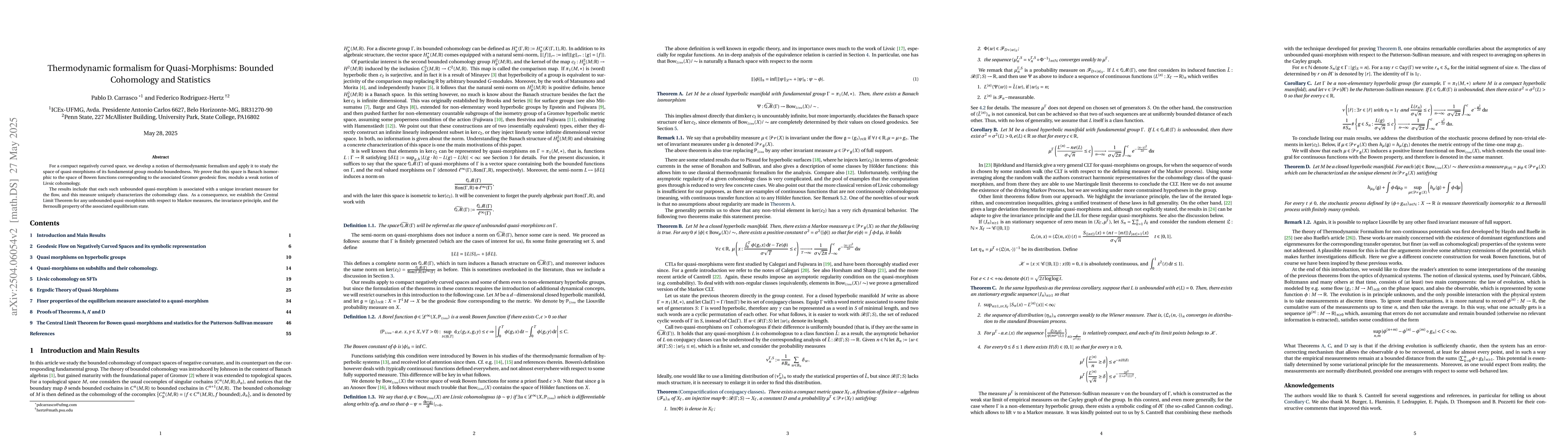 Development of a thermodynamic formalism tailored for quasi-morphisms and its application to Bowen functions, linking bounded cohomology and statistical properties of geodesic flows.