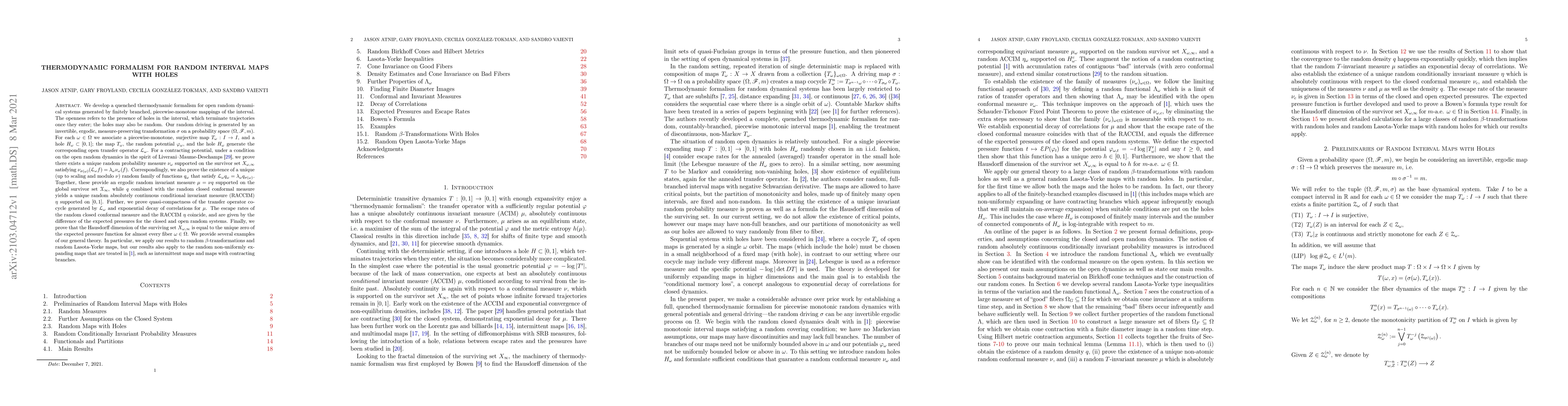 We develop a quenched thermodynamic formalism for open random dynamical systems generated by finitely branched, piecewise-monotone mappings of the interval. The openness refers to the presence of holes in the interval, which terminate trajectories once they enter; the holes may also be random. Our random driving is generated by an invertible, ergodic, measure-preserving transformation $\sigma$ on a probability space $(\Omega,\mathscr{F},m)$. For each $\omega\in\Omega$ we associate a piecewise-monotone, surjective map $T_\omega:I\to I$, and a hole $H_\omega\subset I$; the map $T_\omega$, the random potential $\varphi_\omega$, and the hole $H_\omega$ generate the corresponding open transfer operator $\mathcal{L}_\omega$. For a contracting potential, under a condition on the open random dynamics in the spirit of Liverani--Maume-Deschamps, we prove there exists a unique random probability measure $\nu_\omega$ supported on the survivor set ${X}_{\omega,\infty}$ satisfying $\nu_{\sigma(\omega)}(\mathcal{L}_\omega f)=\lambda_\omega\nu_\omega(f)$. We also prove the existence of a unique random family of functions $q_\omega$ that satisfy $\mathcal{L}_\omega q_\omega=\lambda_\omega q_{\sigma(\omega)}$. These yield an ergodic random invariant measure $\mu=\nu q$ supported on the global survivor set, while $q$ combined with the random closed conformal measure yields a unique random absolutely continuous conditional invariant measure (RACCIM) $\eta$ supported on $I$. We prove quasi-compactness of the transfer operator cocycle and exponential decay of correlations for $\mu$. Finally, the escape rates of the random closed conformal measure and the RACCIM $\eta$ coincide, and are given in terms of the expected pressure, as is the Hausdorff dimension of the surviving set $X_{\omega,\infty}$. We provide examples of our general theory, including random $\beta$-transformations and random Lasota-Yorke maps.