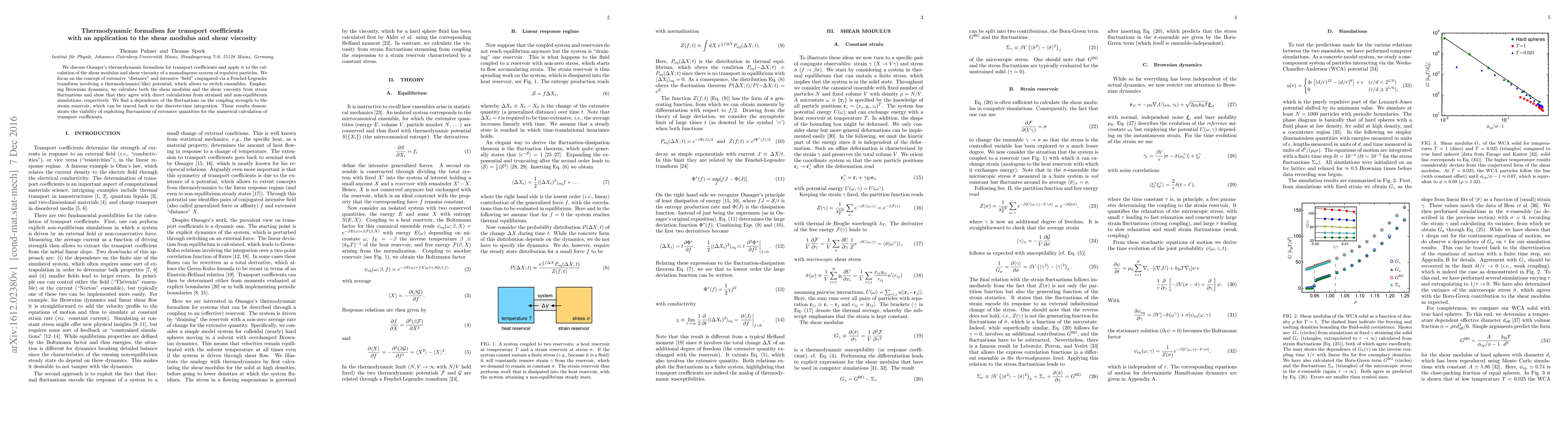 This paper applies Onsager's thermodynamic formalism to compute shear modulus and viscosity in a system of repulsive particles, using Brownian dynamics. Results from fluctuation analysis align with simulations, showing ensemble-switching viability for numerical transport coefficient calculations.