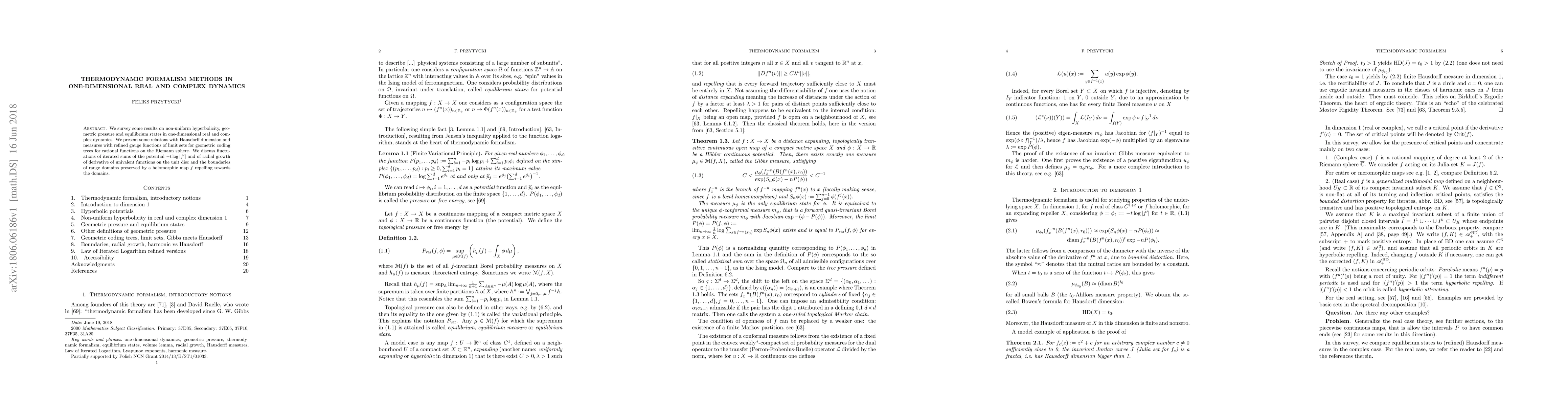 We survey some results on non-uniform hyperbolicity, geometric pressure and equilibrium states in one-dimensional real and complex dynamics. We present some relations with Hausdorff dimension and measures with refined gauge functions of limit sets for geometric coding trees for rational functions on the Riemann sphere. We discuss fluctuations of iterated sums of the potential $-t\log |f'|$ and of radial growth of derivative of univalent functions on the unit disc and the boundaries of range domains preserved by a holomorphic map $f$ repelling towards the domains.