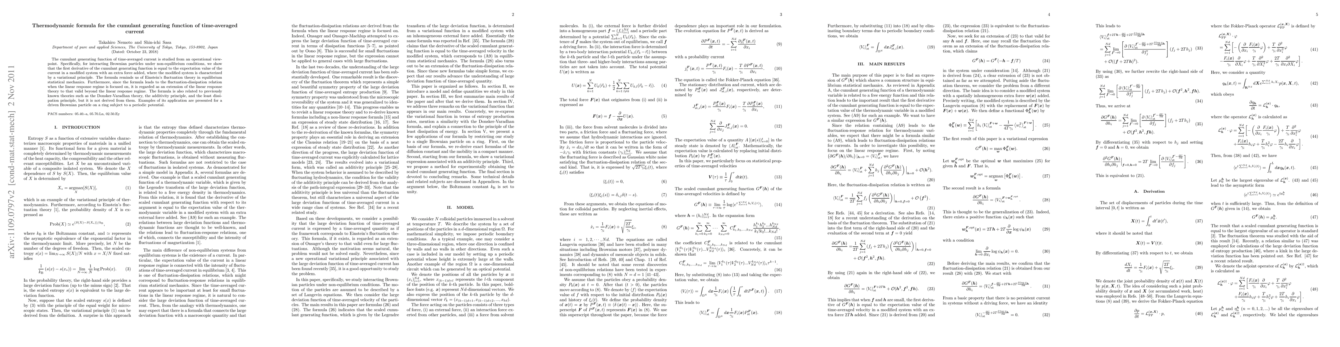 The research develops a thermodynamic formula for the cumulant generating function of time-averaged current in non-equilibrium systems of interacting Brownian particles, extending linear response theory beyond the linear regime. The formula connects to Einstein's fluctuation theory and is exemplified by its application to a driven Brownian particle on a ring.