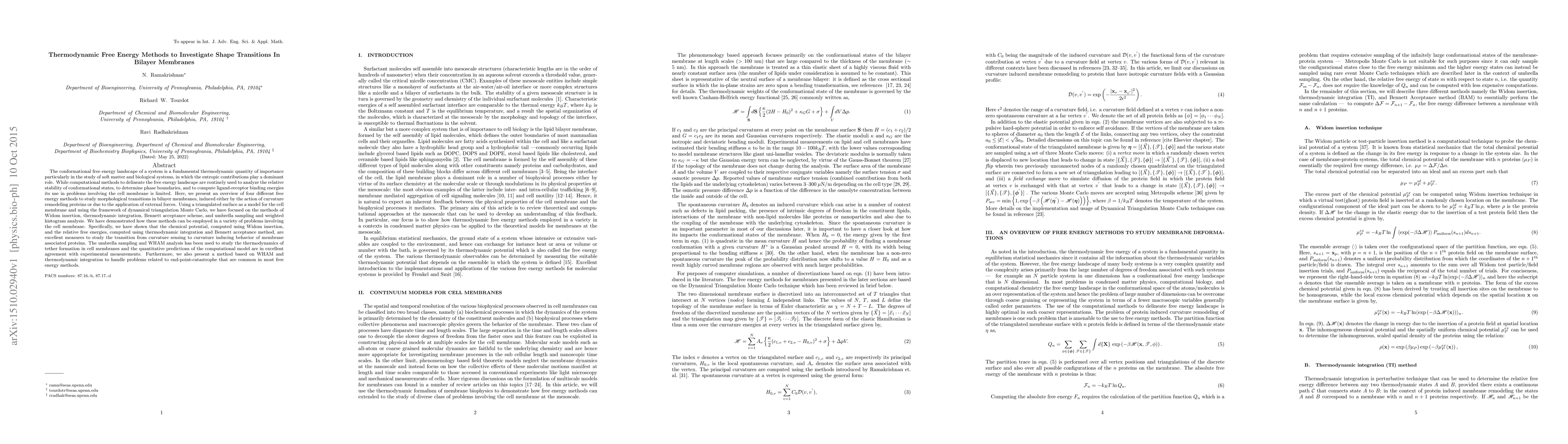 The conformational free energy landscape of a system is a fundamental thermodynamic quantity of importance particularly in the study of soft matter and biological systems, in which the entropic contributions play a dominant role. While computational methods to delineate the free energy landscape are routinely used to analyze the relative stability of conformational states, to determine phase boundaries, and to compute ligand-receptor binding energies its use in problems involving the cell membrane is limited. Here, we present an overview of four different free energy methods to study morphological transitions in bilayer membranes, induced either by the action of curvature remodeling proteins or due to the application of external forces. Using a triangulated surface as a model for the cell membrane and using the framework of dynamical triangulation Monte Carlo, we have focused on the methods of Widom insertion, thermodynamic integration, Bennett acceptance scheme, and umbrella sampling and weighted histogram analysis. We have demonstrated how these methods can be employed in a variety of problems involving the cell membrane. Specifically, we have shown that the chemical potential, computed using Widom insertion, and the relative free energies, computed using thermodynamic integration and Bennett acceptance method, are excellent measures to study the transition from curvature sensing to curvature inducing behavior of membrane associated proteins. The umbrella sampling and WHAM analysis has been used to study the thermodynamics of tether formation in cell membranes and the quantitative predictions of the computational model are in excellent agreement with experimental measurements. Furthermore, we also present a method based on WHAM and thermodynamic integration to handle problems related to end-point-catastrophe that are common in most free energy methods