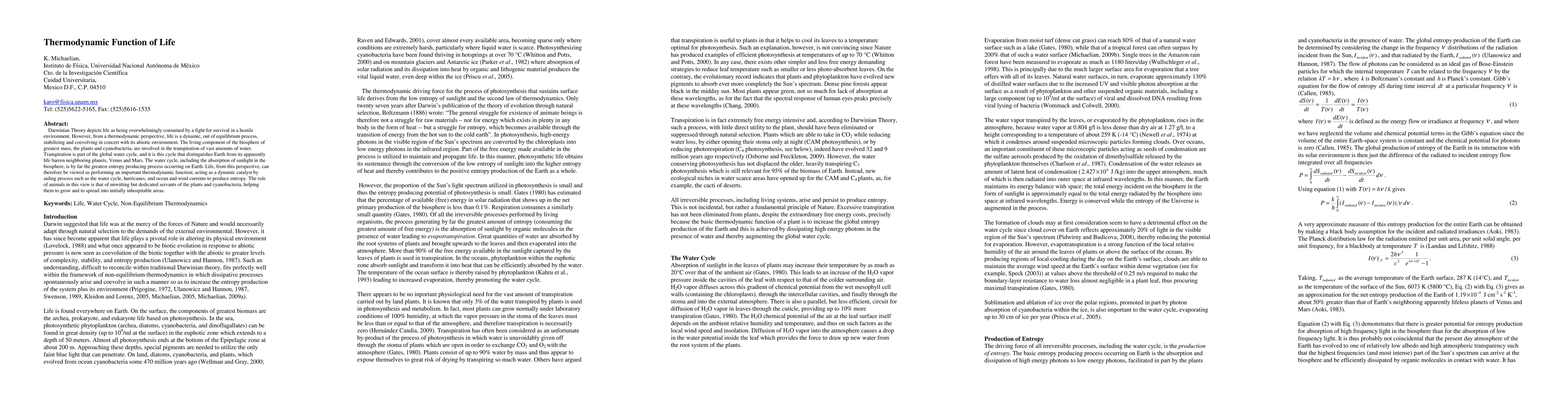 Darwinian Theory depicts life as being overwhelmingly consumed by a fight for survival in a hostile environment. However, from a thermodynamic perspective, life is a dynamic, out of equilibrium process, stabilizing and coevolving in concert with its abiotic environment. The living component of the biosphere of greatest mass, the plants and cyanobacteria, are involved in the transpiration of vast amounts of water. Transpiration is part of the global water cycle, and it is this cycle that distinguishes Earth from its apparently life barren neighboring planets, Venus and Mars. The water cycle, including the absorption of sunlight in the biosphere, is by far the greatest entropy producing process occurring on Earth. Life, from this perspective, can therefore be viewed as performing an important thermodynamic function; acting as a dynamic catalyst by aiding process such as the water cycle, hurricanes, and ocean and wind currents to produce entropy. The role of animals in this view is that of unwitting but dedicated servants of the plants and cyanobacteria, helping them to grow and to spread into initially inhospitable areas.