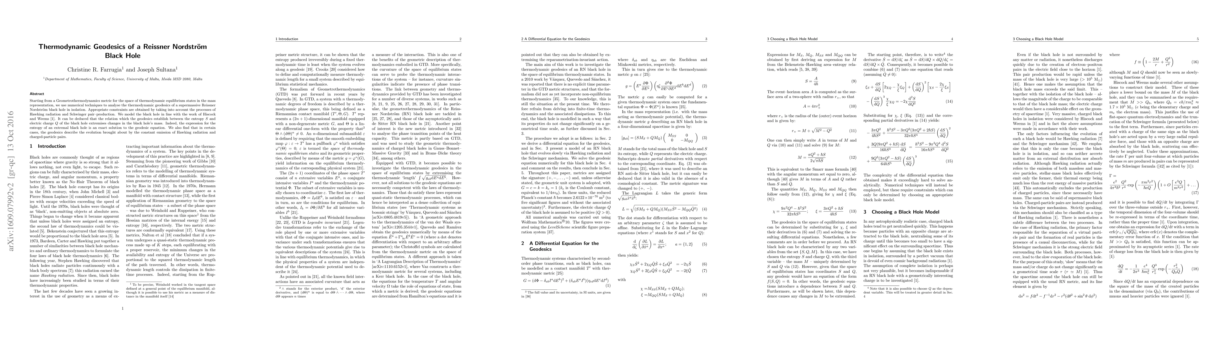 Starting from a Geometrothermodynamics metric for the space of thermodynamic equilibrium states in the mass representation, we use numerical techniques to analyse the thermodynamic geodesics of a supermassive Reissner Nordstr\"{o}m black hole in isolation. Appropriate constraints are obtained by taking into account the processes of Hawking radiation and Schwinger pair--production. We model the black hole in line with the work of Hiscock and Weems. It can be deduced that the relation which the geodesics establish between the entropy $S$ and electric charge $Q$ of the black hole extremises changes in the black hole's mass. Indeed, the expression for the entropy of an extremal black hole is an exact solution to the geodesic equation. We also find that in certain cases, the geodesics describe the evolution brought about by the constant emission of Hawking radiation and charged-particle pairs.