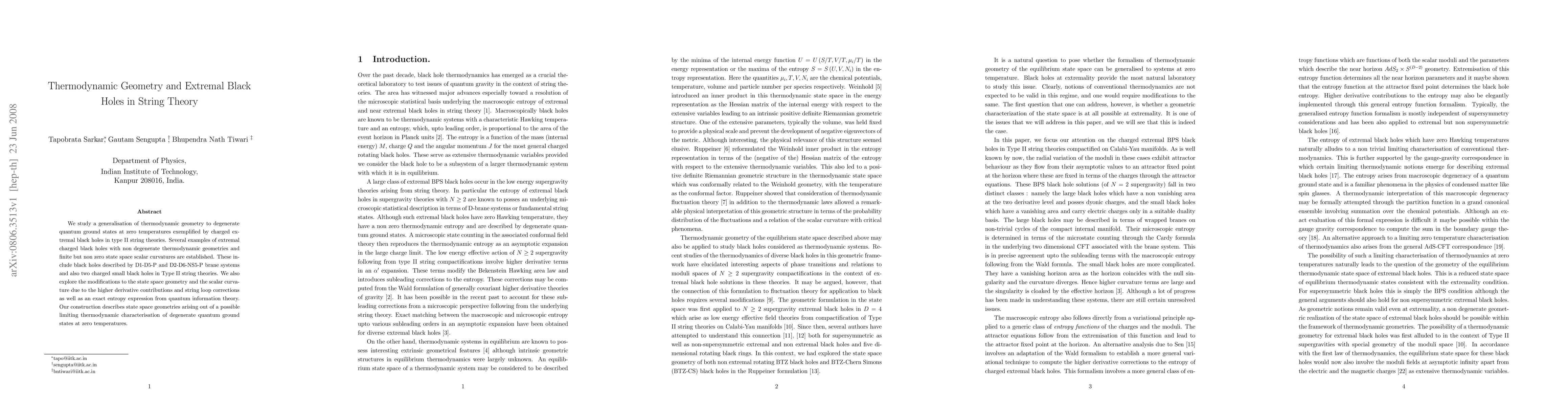 We study a generalisation of thermodynamic geometry to degenerate quantum ground states at zero temperatures exemplified by charged extremal black holes in type II string theories. Several examples of extremal charged black holes with non degenerate thermodynamic geometries and finite but non zero state space scalar curvatures are established. These include black holes described by D1-D5-P and D2-D6-NS5-P brane systems and also two charged small black holes in Type II string theories. We also explore the modifications to the state space geometry and the scalar curvature due to the higher derivative contributions and string loop corrections as well as an exact entropy expression from quantum information theory. Our construction describes state space geometries arising out of a possible limiting thermodynamic characterisation of degenerate quantum ground states at zero temperatures.