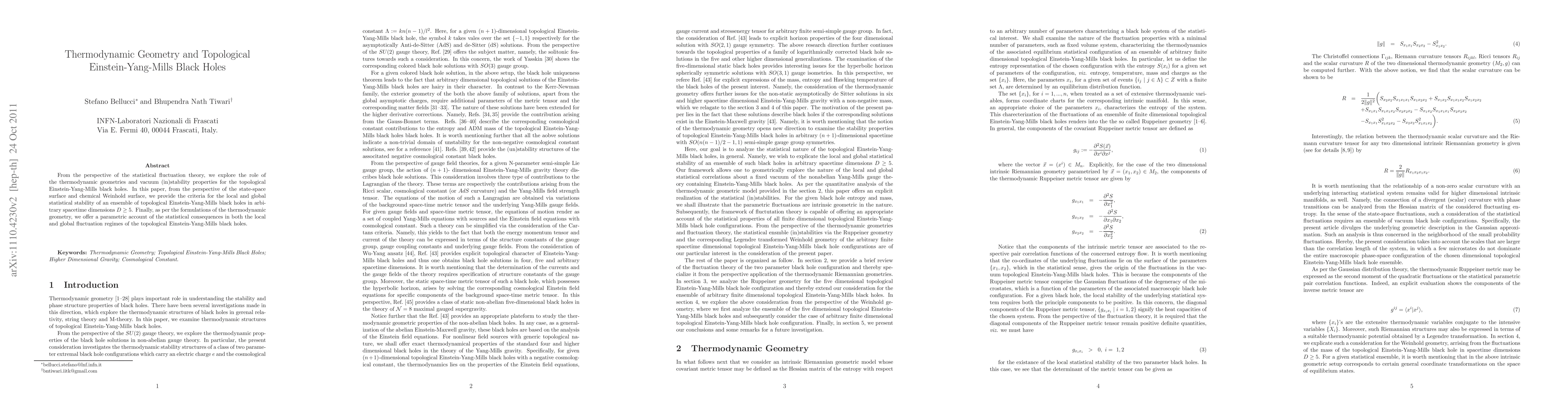 This paper investigates thermodynamic geometries' role in the stability of topological Einstein-Yang-Mills black holes, using statistical fluctuation theory. It provides criteria for their local and global statistical stability in arbitrary dimensions $D\ge 5$ and offers parametric accounts of their statistical fluctuations.