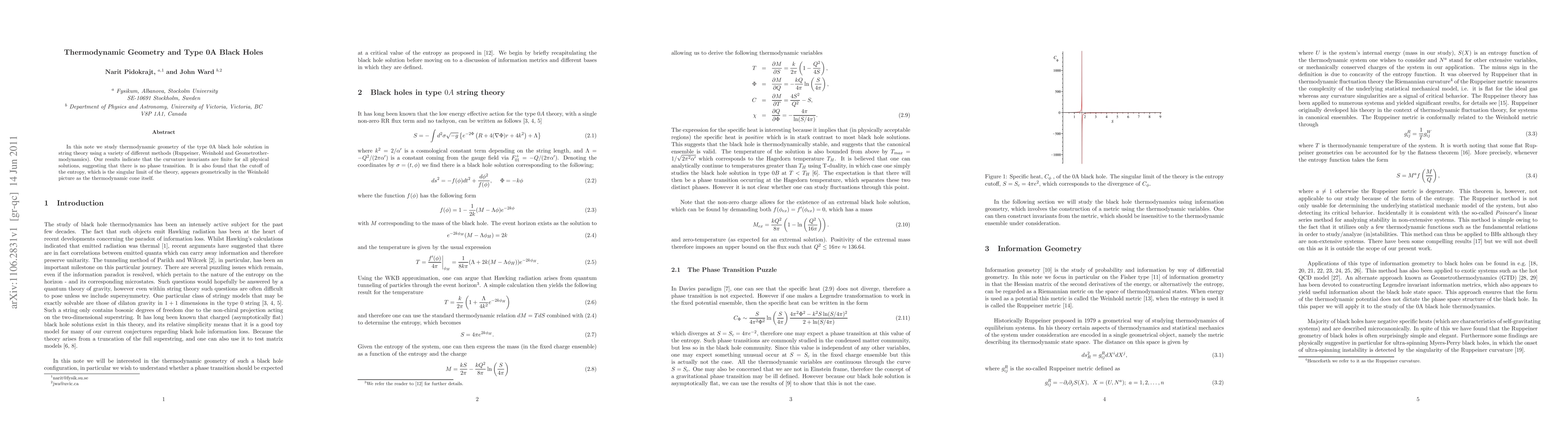 The study of type 0A black holes in string theory reveals no phase transition between physical solutions, with finite curvature invariants and a cutoff in entropy appearing geometrically in the thermodynamic cone.